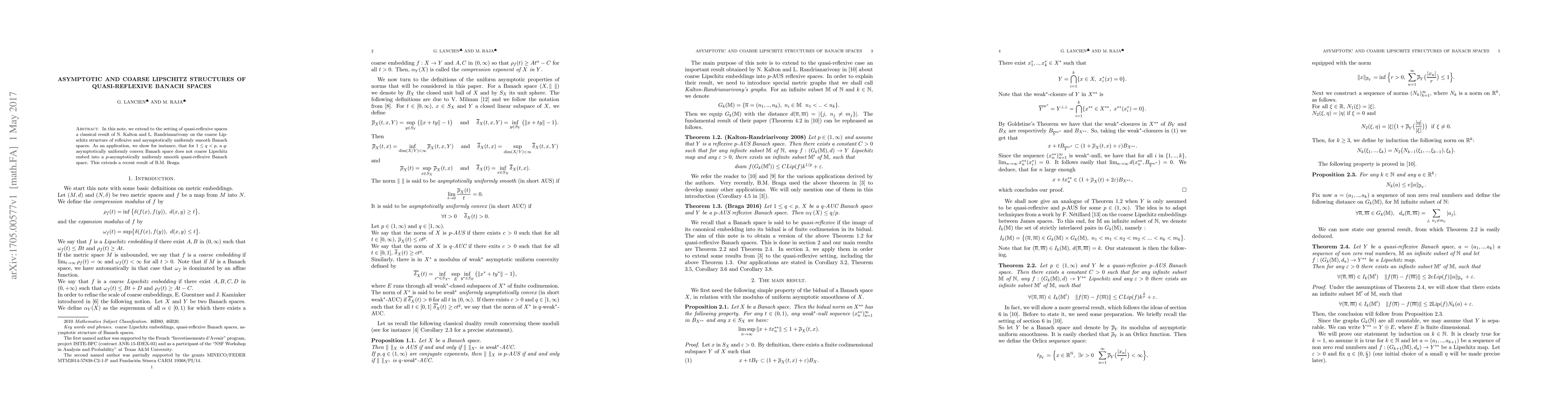 This paper extends a classical result on the coarse Lipschitz structure of reflexive Banach spaces to quasi-reflexive spaces, demonstrating that certain embedding properties do not hold for $q$-asymptotically uniformly convex Banach spaces when embedding into $p$-asymptotically uniformly smooth quasi-reflexive Banach spaces.