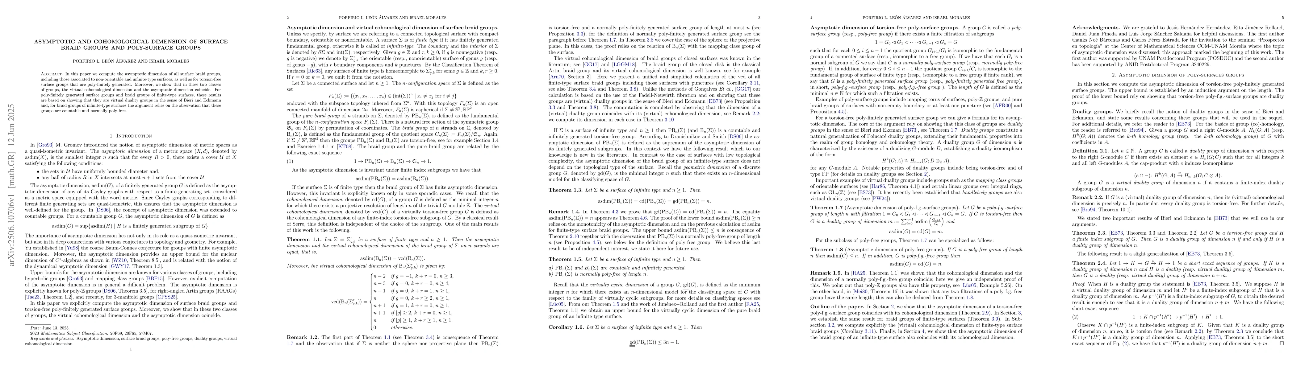 In this paper we compute the asymptotic dimension of all surface braid groups, including those associated to non-orientable and infinite-type surfaces, as well as for torsion-free surface groups that are poly-finitely generated. Moreover, we show that in these two classes of groups, the virtual cohomological dimension and the asymptotic dimension coincide. For poly-finitely generated surface groups and braid groups of finite-type surfaces, these results are based on showing that they are virtual duality groups in the sense of Bieri and Eckmann and, for braid groups of infinite-type surfaces the argument relies on the observation that these groups are countable and normally poly-free.