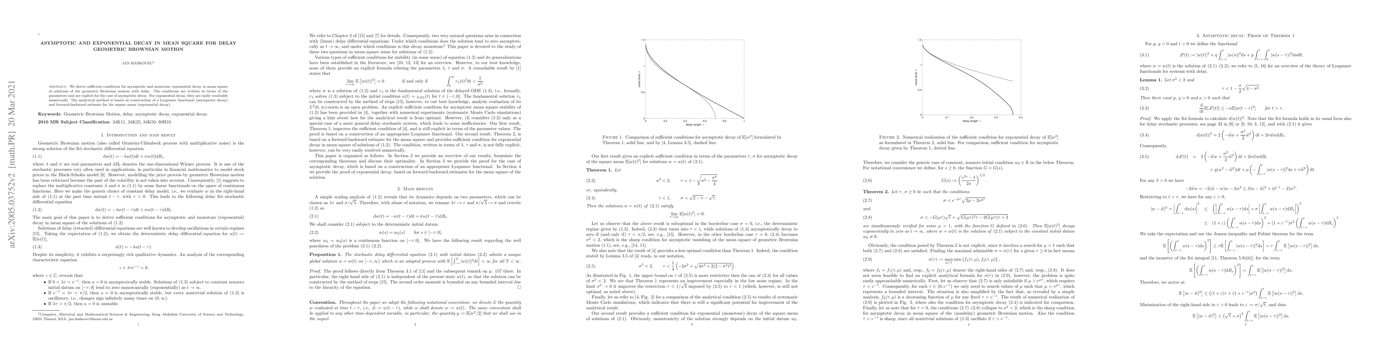 This paper establishes sufficient conditions for asymptotic and exponential decay in mean square for delayed geometric Brownian motion, utilizing a Lyapunov functional for asymptotic decay and a forward-backward estimate for exponential decay. The conditions are explicitly defined for asymptotic decay and numerically resolvable for exponential decay.