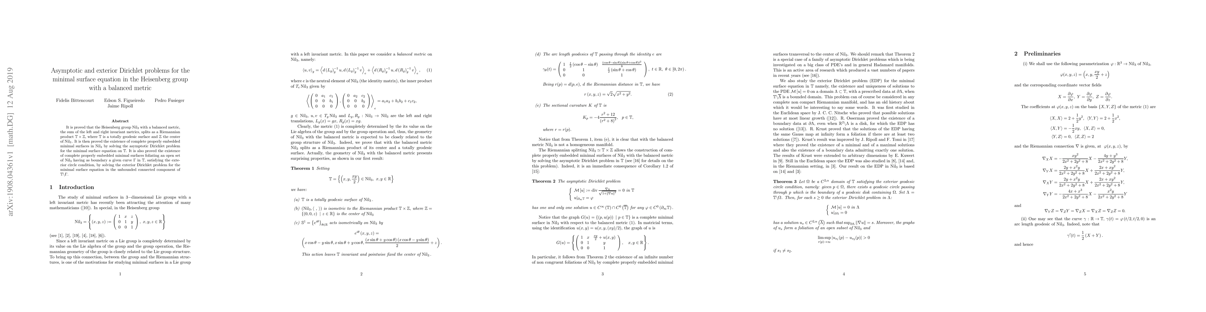 It is proved that the Heisenberg group $\operatorname*{Nil}\nolimits_{3}$ with a balanced metric, the sum of the left and right invariant metrics, splits as a Riemannian product $\mathbb{T\times Z}$, where $\mathbb{T}$ is a totally geodesic surface and $\mathbb{Z}$ the center of $\operatorname*{Nil}% \nolimits_{3}.$ It is then proved the existence of complete properly embedded minimal surfaces in $\operatorname*{Nil}\nolimits_{3}$ by solving the asymptotic Dirichlet problem for the minimal surface equation on $\mathbb{T}$. It is also proved the existence of complete properly embedded minimal surfaces foliating an open set of $\operatorname*{Nil}\nolimits_{3}$ having as boundary a given curve $\Gamma$ in $\mathbb{T},$ satisfying the exterior circle condition, by solving the exterior Dirichlet problem for the minimal surface equation in the unbounded connected component of $\mathbb{T}\backslash\Gamma$.