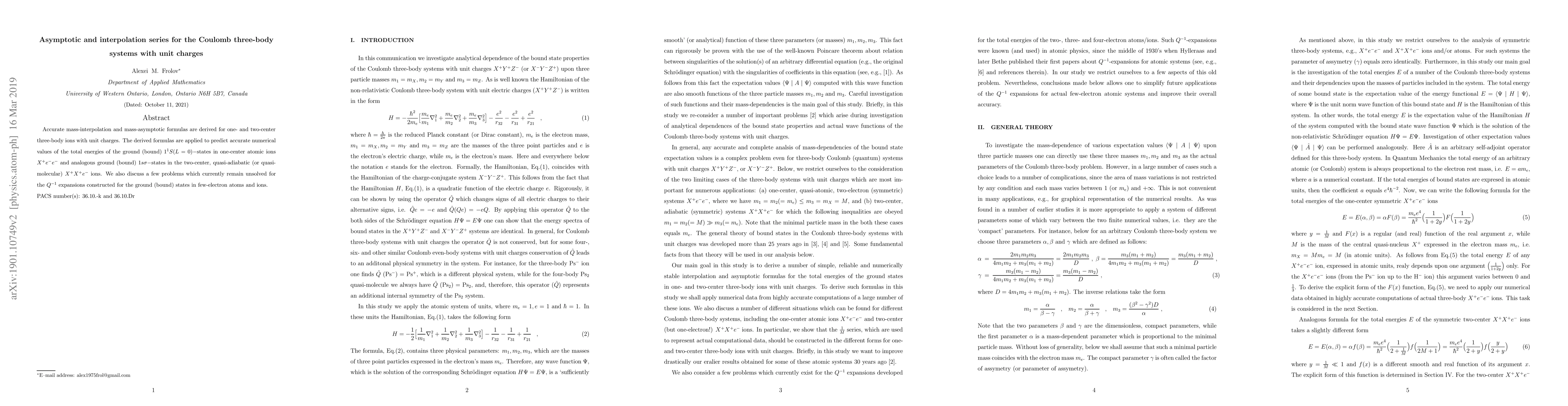 This paper derives mass-interpolation and mass-asymptotic formulas for Coulomb three-body systems with unit charges, applying them to predict accurate total energies of ground states in one-center and two-center atomic ions. It also highlights unresolved issues in $Q^{-1}$ expansions for few-electron atoms and ions.