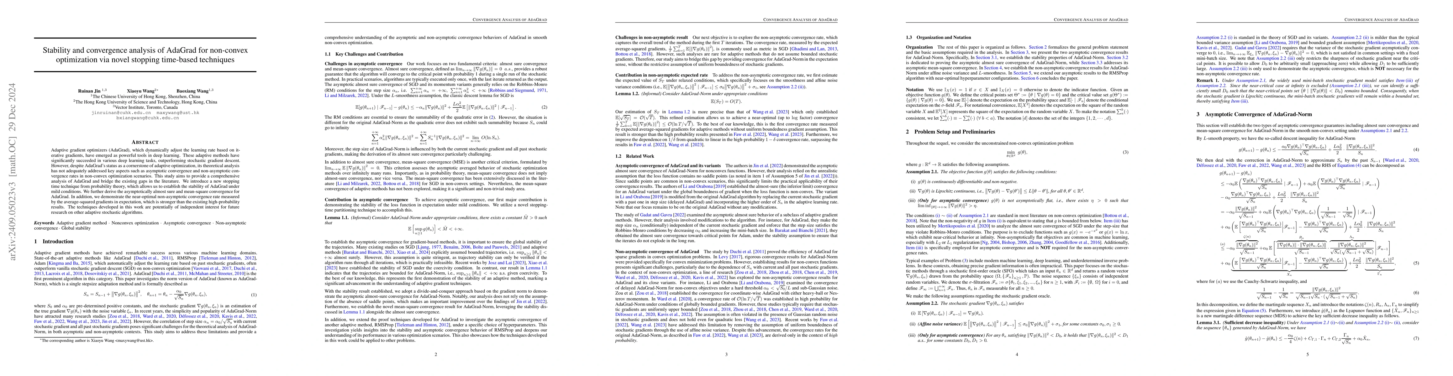 This paper provides a novel analysis of the AdaGrad optimizer for non-convex optimization, introducing a stopping time technique to establish norm stability under milder conditions. It derives asymptotic convergence in almost sure and mean-square forms and demonstrates near-optimal non-asymptotic convergence rates, enhancing the theoretical understanding of adaptive optimizers in deep learning.