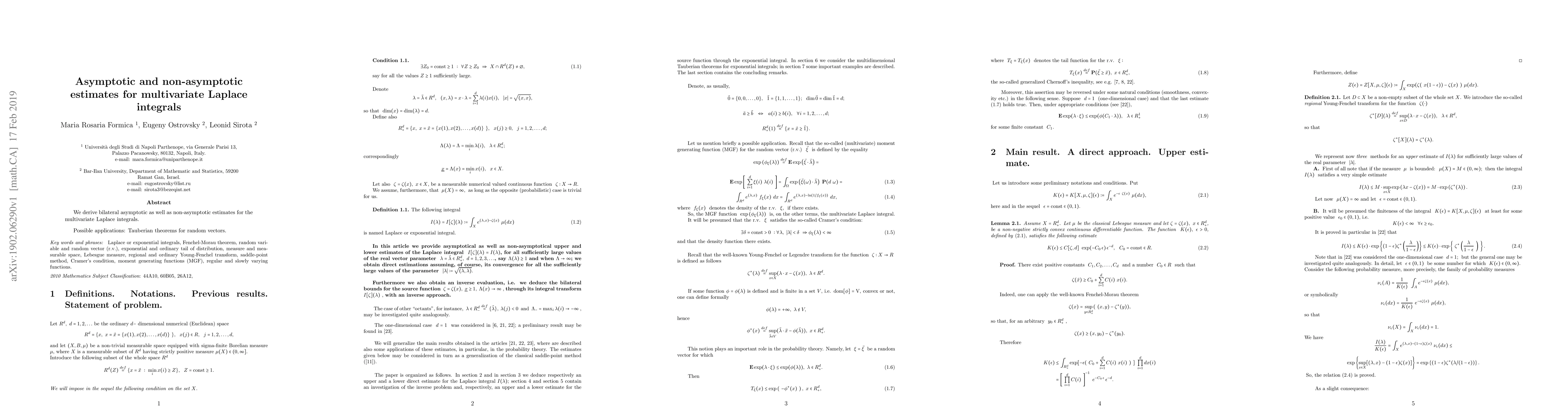 Summary: This paper provides both asymptotic and non-asymptotic estimates for multivariate Laplace integrals, with potential applications in developing Tauberian theorems for random vectors.