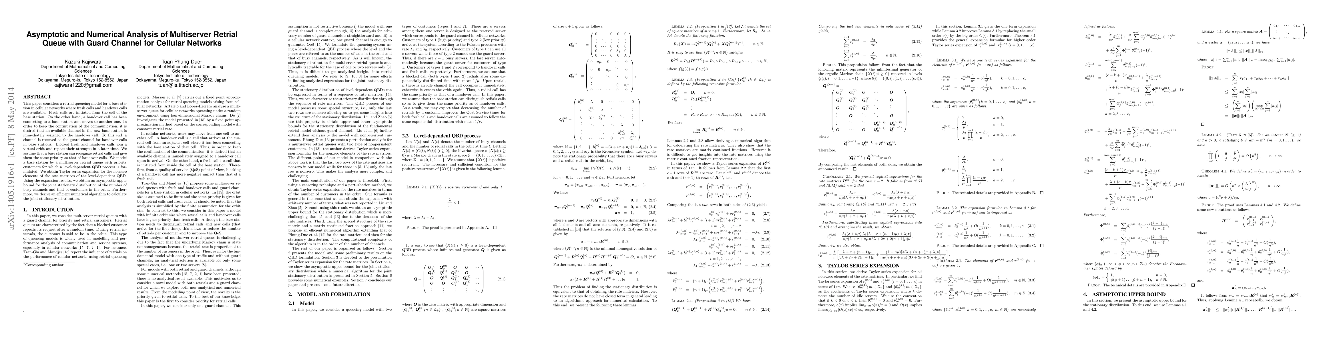 This paper analyzes a multiserver retrial queue model for cellular networks with guard channels to prioritize handover calls, employing a level-dependent QBD process and deriving an asymptotic upper bound and numerical algorithm for the joint stationary distribution of busy channels and retrial customers.