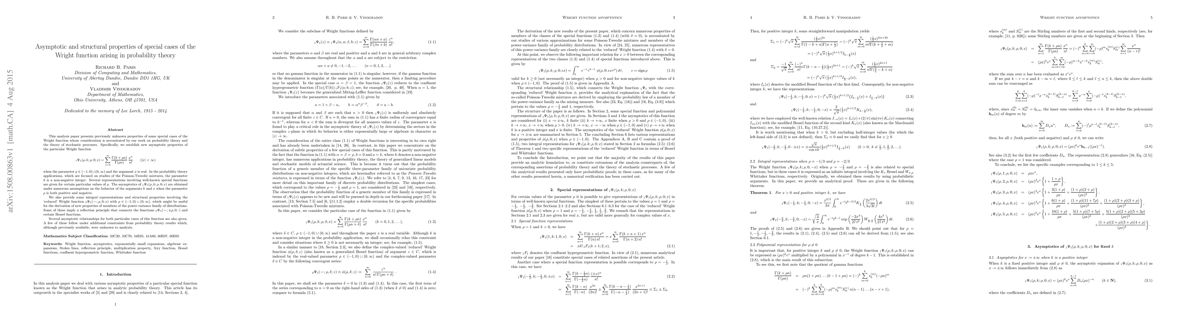 This analysis paper presents previously unknown properties of some special cases of the Wright function whose consideration is necessitated by our work on probability theory and the theory of stochastic processes. Specifically, we establish new asymptotic properties of the particular Wright function \[{}_1\Psi_1(\rho,k; \rho,0;x)= \sum_{n=0}^\infty\frac{\Gamma(k+\rho n)}{\Gamma(\rho n)}\,\frac{x^n}{n!}\qquad (|x|<\infty)\] when the parameter $\rho\in (-1,0)\cup (0,\infty)$ and the argument $x$ is real. In the probability theory applications, which are focused on studies of the Poisson-Tweedie mixtures, the parameter $k$ is a non-negative integer. Several representations involving well-known special functions are given for certain particular values of $\rho$. The asymptotics of ${}_1\Psi_1(\rho,k;\rho,0;x)$ are obtained under numerous assumptions on the behavior of the arguments $k$ and $x$ when the parameter $\rho$ is both positive and negative. We also provide some integral representations and structural properties involving the `reduced' Wright function ${}_0\Psi_1(-\!\!\!-; \rho,0;x)$ with $\rho\in (-1,0)\cup (0,\infty)$, which might be useful for the derivation of new properties of members of the power-variance family of distributions. Some of these imply a reflection principle that connects the functions ${}_0\Psi_1(-\!\!\!-; \pm\rho, 0;\cdot)$ and certain Bessel functions. Several asymptotic relationships for both particular cases of this function are also given. A few of these follow under additional constraints from probability theory results which, although previously available, were unknown to analysts.