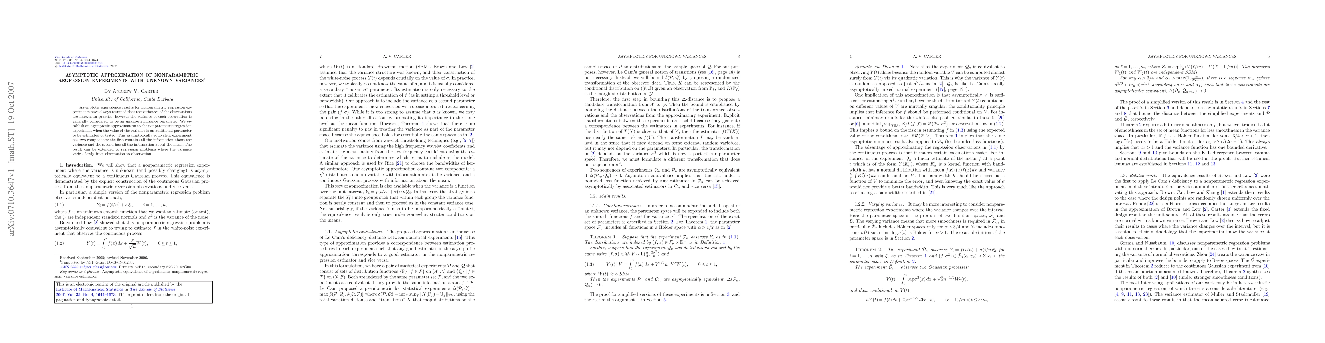 Asymptotic equivalence results for nonparametric regression experiments have always assumed that the variances of the observations are known. In practice, however the variance of each observation is generally considered to be an unknown nuisance parameter. We establish an asymptotic approximation to the nonparametric regression experiment when the value of the variance is an additional parameter to be estimated or tested. This asymptotically equivalent experiment has two components: the first contains all the information about the variance and the second has all the information about the mean. The result can be extended to regression problems where the variance varies slowly from observation to observation.