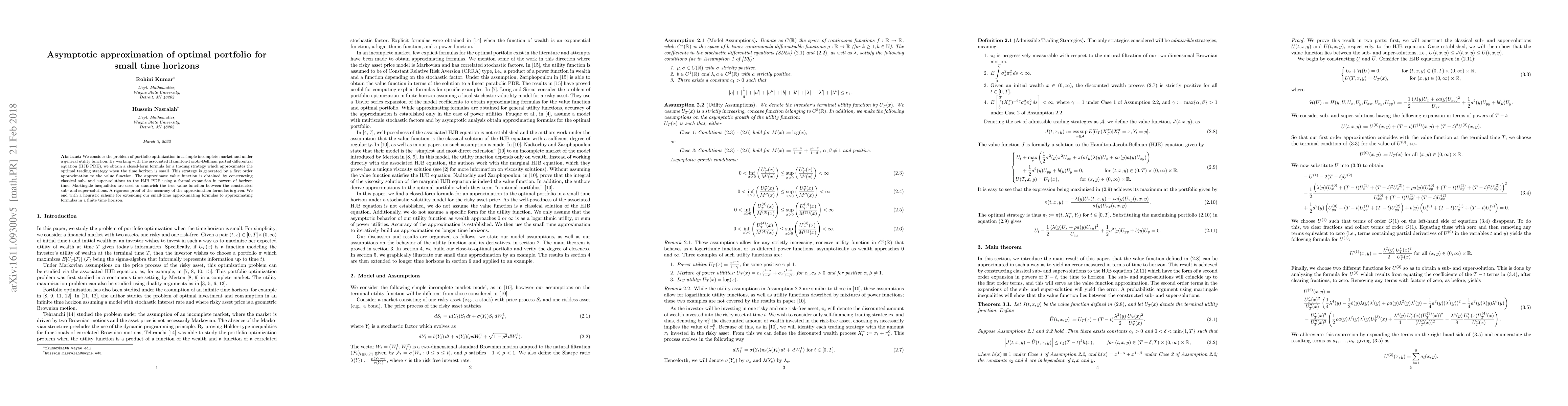 Researchers develop a formula to approximate optimal portfolio strategies for short time horizons in incomplete markets, using a Hamilton-Jacobi-Bellman equation and martingale inequalities. The approach provides a closed-form solution for small-time horizon optimization.