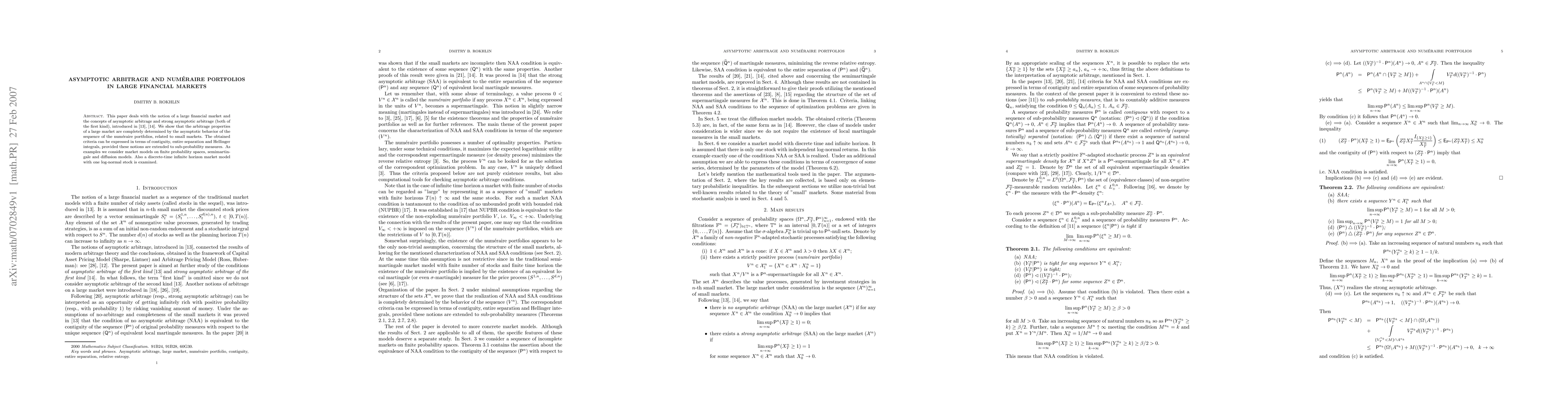 This paper explores the concepts of asymptotic arbitrage and strong asymptotic arbitrage in large financial markets, demonstrating that market arbitrage properties are determined by the asymptotic behavior of numéraire portfolios. The criteria for these properties are expressed through extended notions of contiguity, entire separation, and Hellinger integrals applied to sub-probability measures.
