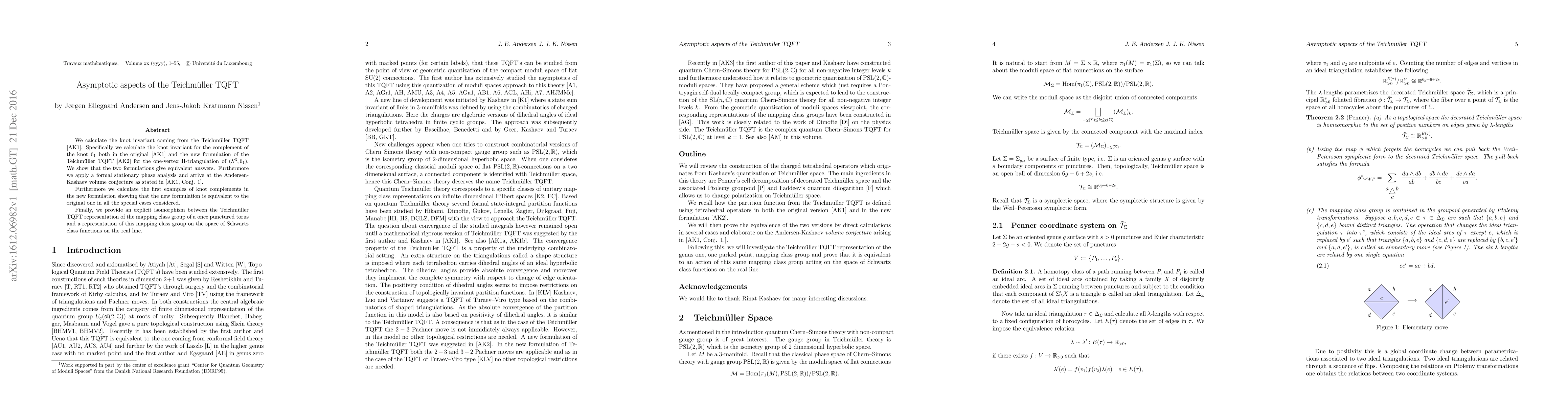 We calculate the knot invariant coming from the Teichm\"{u}ller TQFT [AK1]. Specifically we calculate the knot invariant for the complement of the knot $6_1$ both in the original [AK1] and the new formulation of the Teichm\"{u}ller TQFT [AK2] for the one-vertex H-triangulation of $(S^3,6_1)$. We show that the two formulations give equivalent answers. Furthermore we apply a formal stationary phase analysis and arrive at the Andersen- Kashaev volume conjecture as stated in [AK1, Conj. 1]. Furthermore we calculate the first examples of knot complements in the new formulation showing that the new formulation is equivalent to the original one in all the special cases considered. Finally, we provide an explicit isomorphism between the Teichm\"{u}ller TQFT representation of the mapping class group of a once punctured torus and a representation of this mapping class group on the space of Schwartz class functions on the real line.
