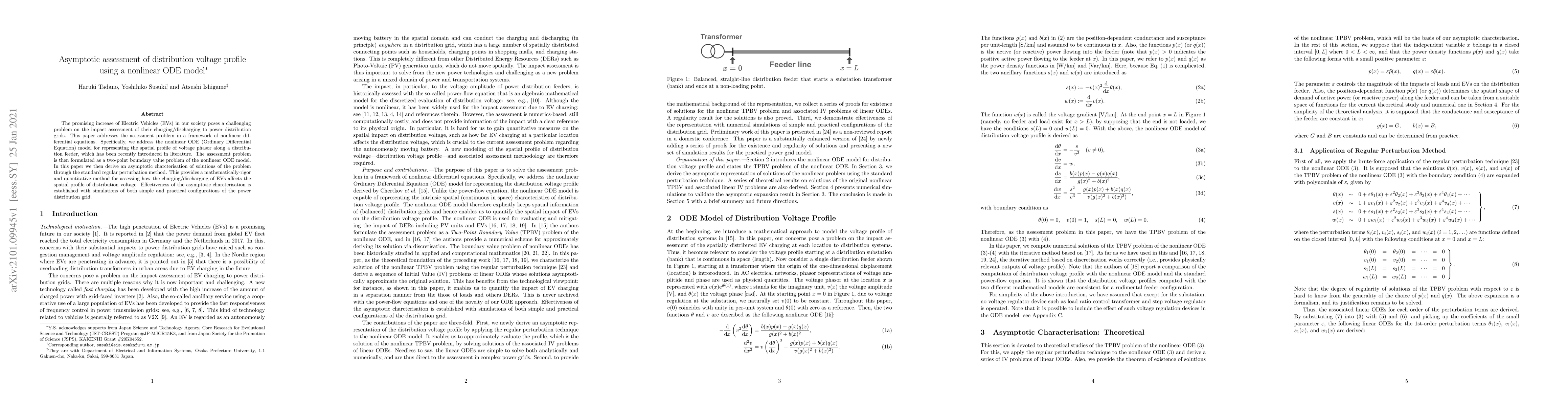 The promising increase of Electric Vehicles (EVs) in our society poses a challenging problem on the impact assessment of their charging/discharging to power distribution grids. This paper addresses the assessment problem in a framework of nonlinear differential equations. Specifically, we address the nonlinear ODE (Ordinary Differential Equation) model for representing the spatial profile of voltage phasor along a distribution feeder, which has been recently introduced in literature. The assessment problem is then formulated as a two-point boundary value problem of the nonlinear ODE model. In this paper we derive an asymptotic charcterisation of solutions of the problem through the standard regular perturbation method. This provides a mathematically-rigor and quantitative method for assessing how the charging/discharging of EVs affects the spatial profile of distribution voltage. Effectiveness of the asymptotic charcterisation is established with simulations of both simple and practical configurations of the power distribution grid.