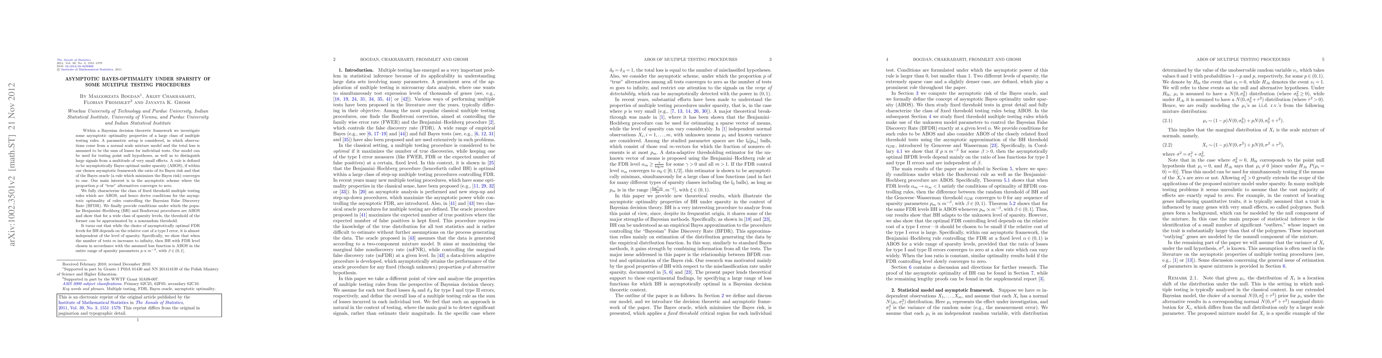 This paper explores asymptotic optimality properties of multiple testing procedures under sparsity within a Bayesian framework. It characterizes fixed threshold rules that are asymptotically Bayes optimal under sparsity (ABOS) and shows that popular methods like Benjamini-Hochberg and Bonferroni can be ABOS under certain conditions.