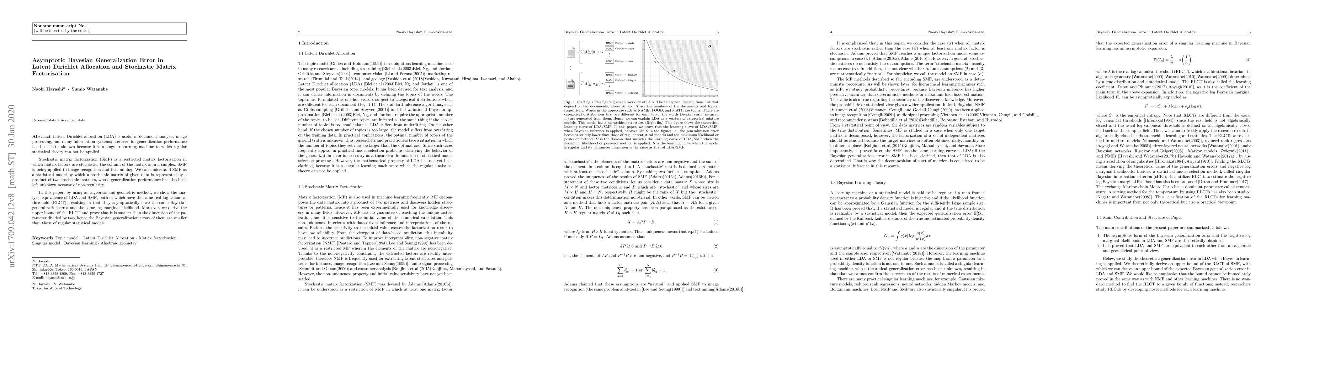 This paper demonstrates that Latent Dirichlet Allocation (LDA) and Stochastic Matrix Factorization (SMF) are analytically equivalent, showing they share the same Bayesian generalization error and log marginal likelihood. It also proves that their generalization errors are lower than those of regular statistical models due to a derived upper bound on their real log canonical threshold.