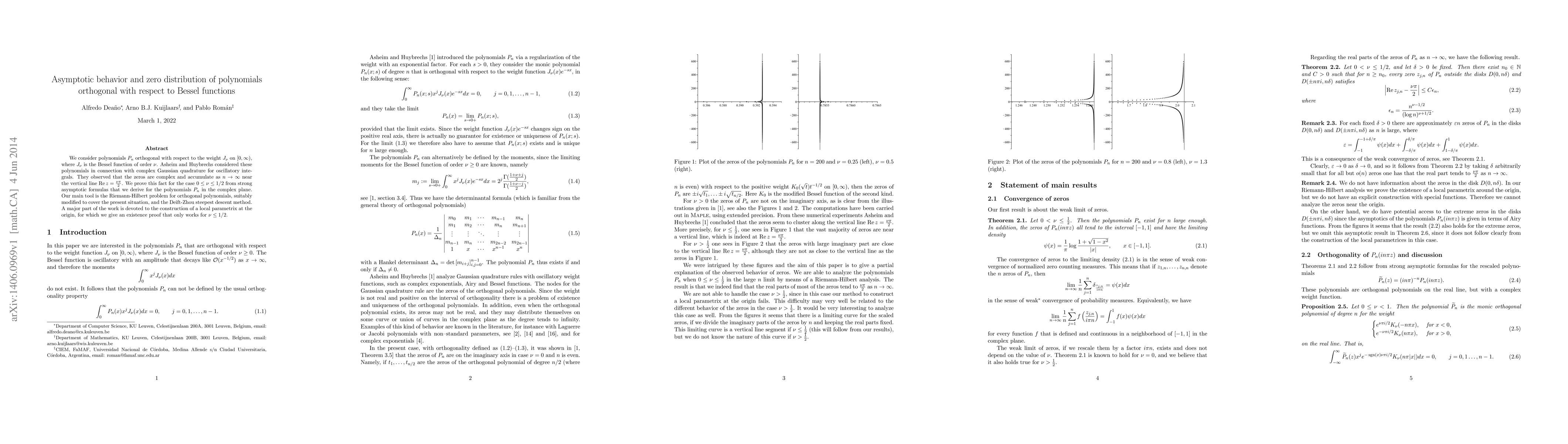 This paper investigates the asymptotic behavior and zero distribution of polynomials orthogonal to Bessel functions, proving that their zeros accumulate near the vertical line Re(z) = νπ/2 for 0 ≤ ν ≤ 1/2 using Riemann-Hilbert problems and the steepest descent method, with a special focus on constructing a local parametrix at the origin.