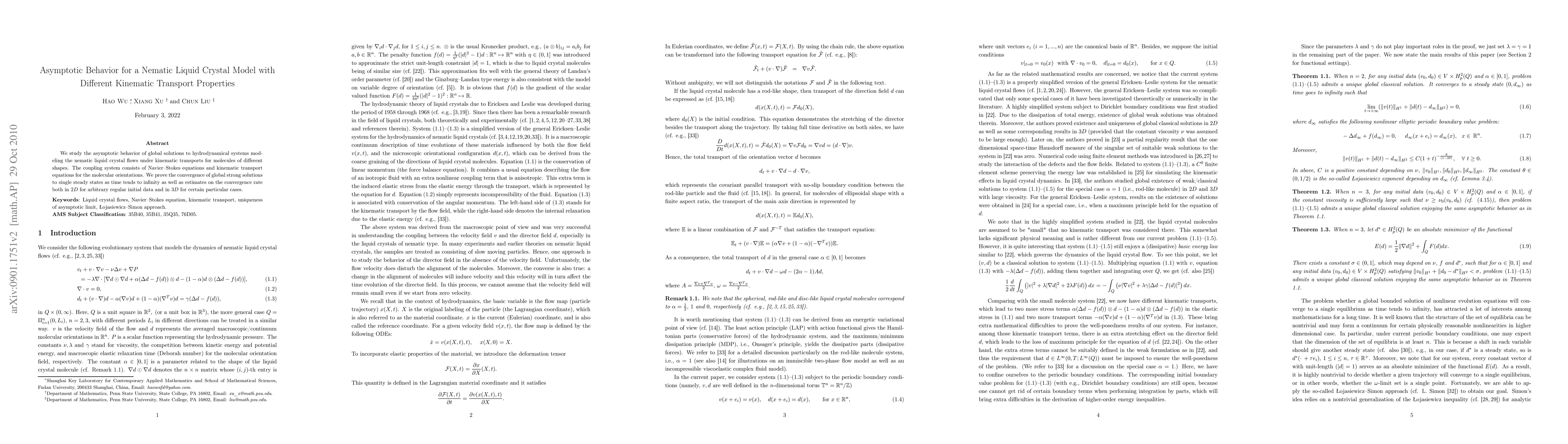 The paper investigates the long-term behavior of solutions in models describing nematic liquid crystal flows with varying molecular shapes. It proves that global strong solutions converge to steady states as time progresses, with convergence rates established for specific 2D and 3D cases.