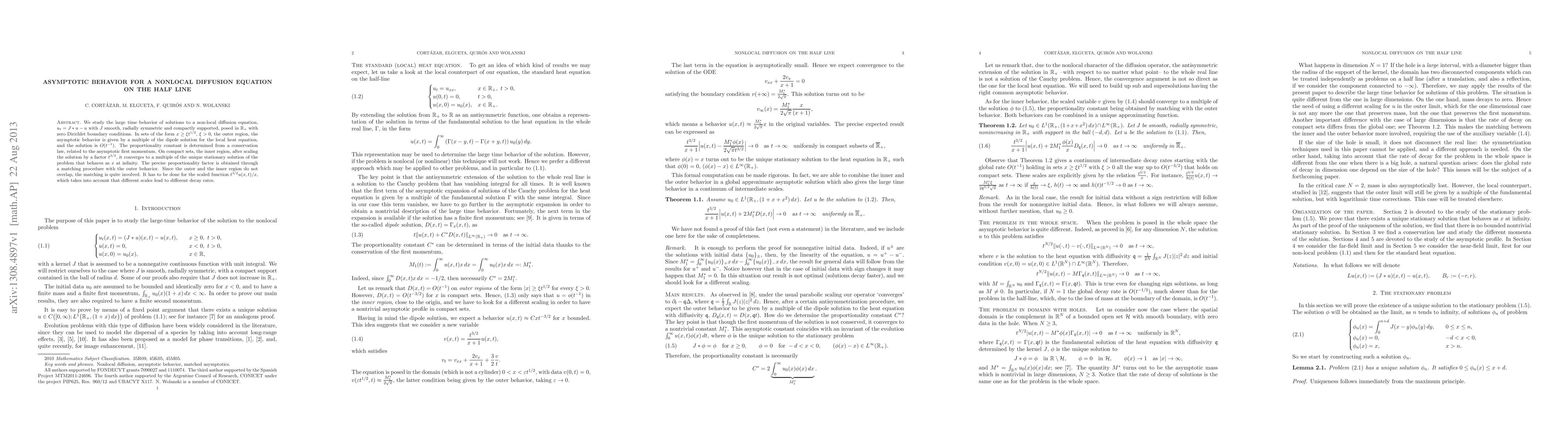 We study the large time behavior of solutions to a non-local diffusion equation, $u_t=J*u-u$ with $J$ smooth, radially symmetric and compactly supported, posed in $\mathbb{R}_+$ with zero Dirichlet boundary conditions. In sets of the form $x\ge \xi t^{1/2}$, $\xi>0$, the outer region, the asymptotic behavior is given by a multiple of the dipole solution for the local heat equation, and the solution is $O(t^{-1})$. The proportionality constant is determined from a conservation law, related to the asymptotic first momentum. On compact sets, the inner region, after scaling the solution by a factor $t^{3/2}$, it converges to a multiple of the unique stationary solution of the problem that behaves as $x$ at infinity. The precise proportionality factor is obtained through a matching procedure with the outer behavior. Since the outer and the inner region do not overlap, the matching is quite involved. It has to be done for the scaled function $t^{3/2}u(x,t)/x$, which takes into account that different scales lead to different decay rates.