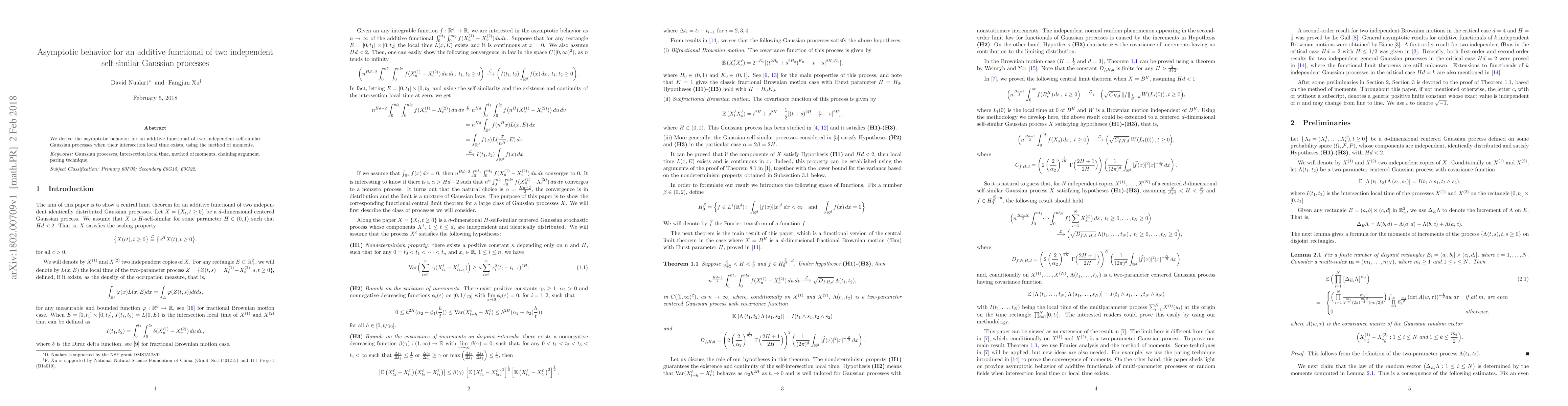 We derive the asymptotic behavior for an additive functional of two independent self-similar Gaussian processes when their intersection local time exists, using the method of moments.