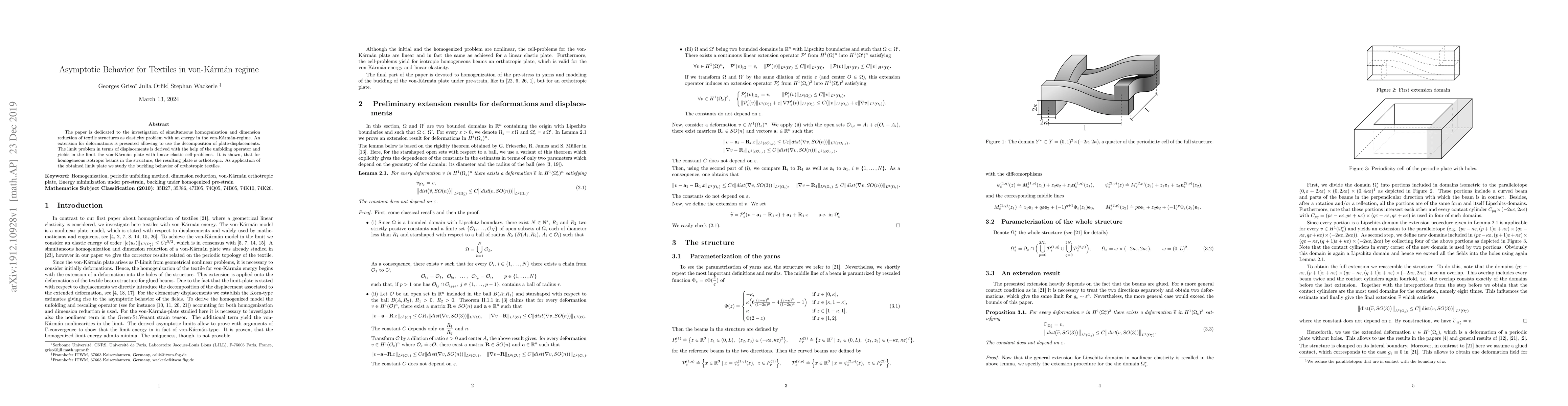 The paper is dedicated to the investigation of simultaneous homogenization and dimension reduction of textile structures as elasticity problem with an energy in the von-K{\'a}rm{\'a}n-regime. An extension for deformations is presented allowing to use the decomposition of plate-displacements. The limit problem in terms of displacements is derived with the help of the unfolding operator and yields in the limit the von-K{\'a}rm{\'a}n plate with linear elastic cell-problems. It is shown, that for homogeneous isotropic beams in the structure, the resulting plate is orthotropic. As application of the obtained limit plate we study the buckling behavior of orthotropic textiles.