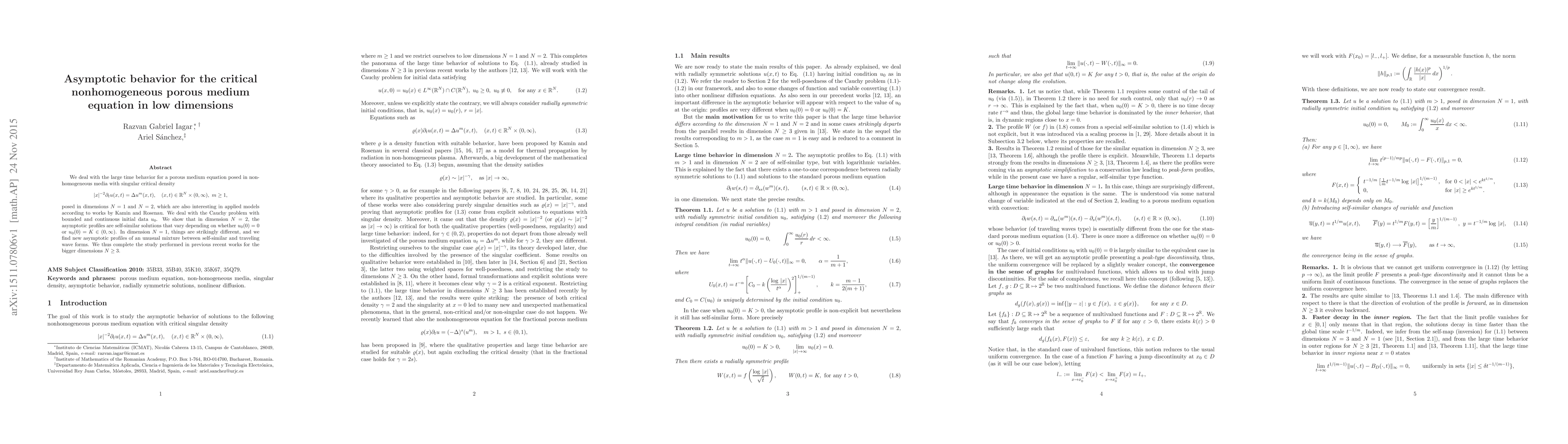 We deal with the large time behavior for a porous medium equation posed in nonhomogeneous media with singular critical density $$ |x|^{-2}\partial_tu(x,t)=\Delta u^m(x,t), \quad (x,t)\in \real^N\times(0,\infty), \ m\geq1, $$ posed in dimensions $N=1$ and $N=2$, which are also interesting in applied models according to works by Kamin and Rosenau. We deal with the Cauchy problem with bounded and continuous initial data $u_0$. We show that in dimension $N=2$, the asymptotic profiles are self-similar solutions that vary depending on whether $u_0(0)=0$ or $u_0(0)=K\in(0,\infty)$. In dimension $N=1$, things are strikingly different, and we find new asymptotic profiles of an unusual mixture between self-similar and traveling wave forms. We thus complete the study performed in previous recent works for the bigger dimensions $N\geq3$.