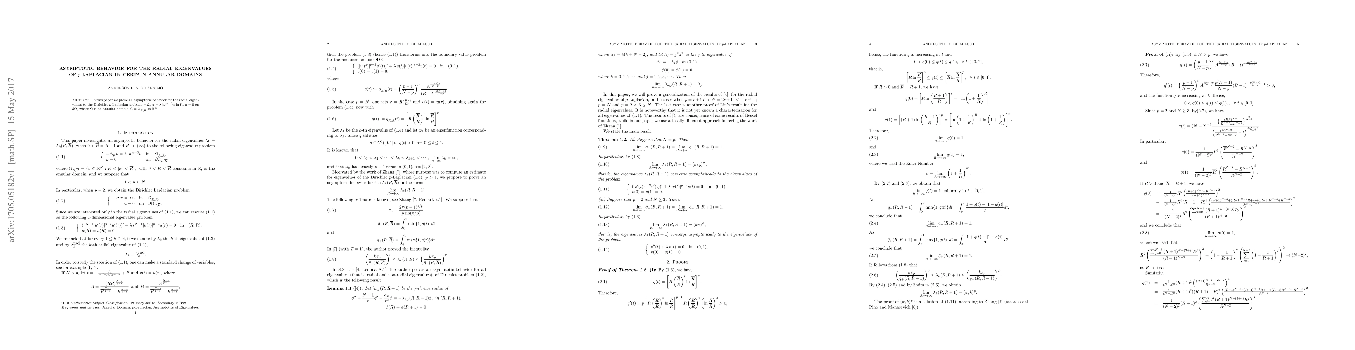 This paper establishes the asymptotic behavior of radial eigenvalues for the Dirichlet $p$-Laplacian problem in annular domains $\Omega_{R,\overline{R}}$, demonstrating how the eigenvalues relate to the geometry of the domain. The results provide insights into the spectral properties of the $p$-Laplacian operator in such settings.