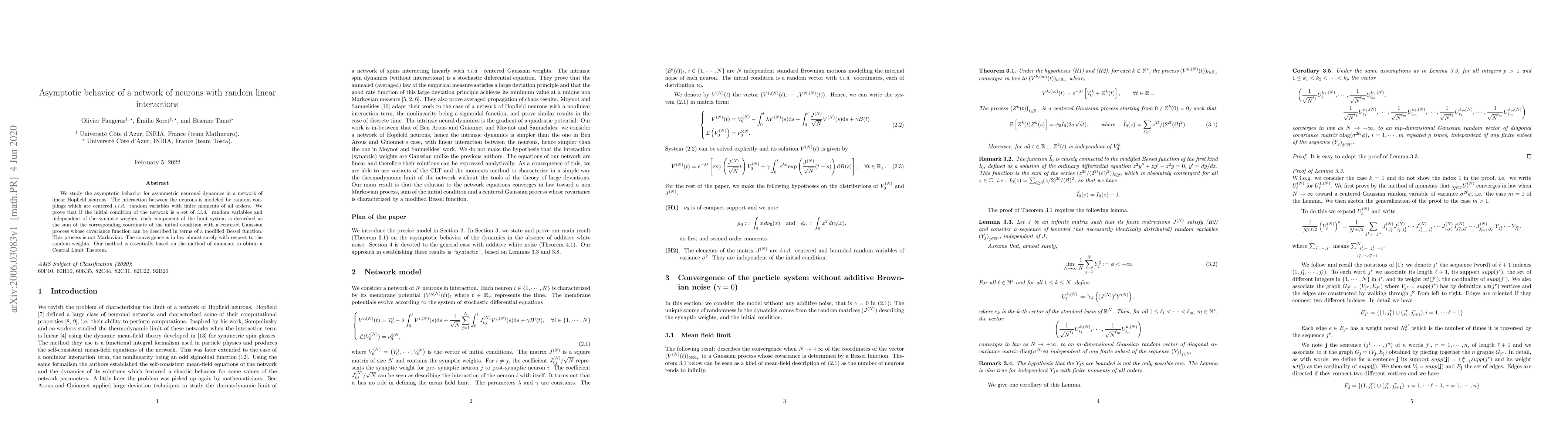 We study the asymptotic behavior for asymmetric neuronal dynamics in a network of linear Hopfield neurons. The interaction between the neurons is modeled by random couplings which are centered i.i.d. random variables with finite moments of all orders. We prove that if the initial condition of the network is a set of i.i.d. random variables and independent of the synaptic weights, each component of the limit system is described as the sum of the corresponding coordinate of the initial condition with a centered Gaussian process whose covariance function can be described in terms of a modified Bessel function. This process is not Markovian. The convergence is in law almost surely with respect to the random weights. Our method is essentially based on the method of moments to obtain a Central Limit Theorem.