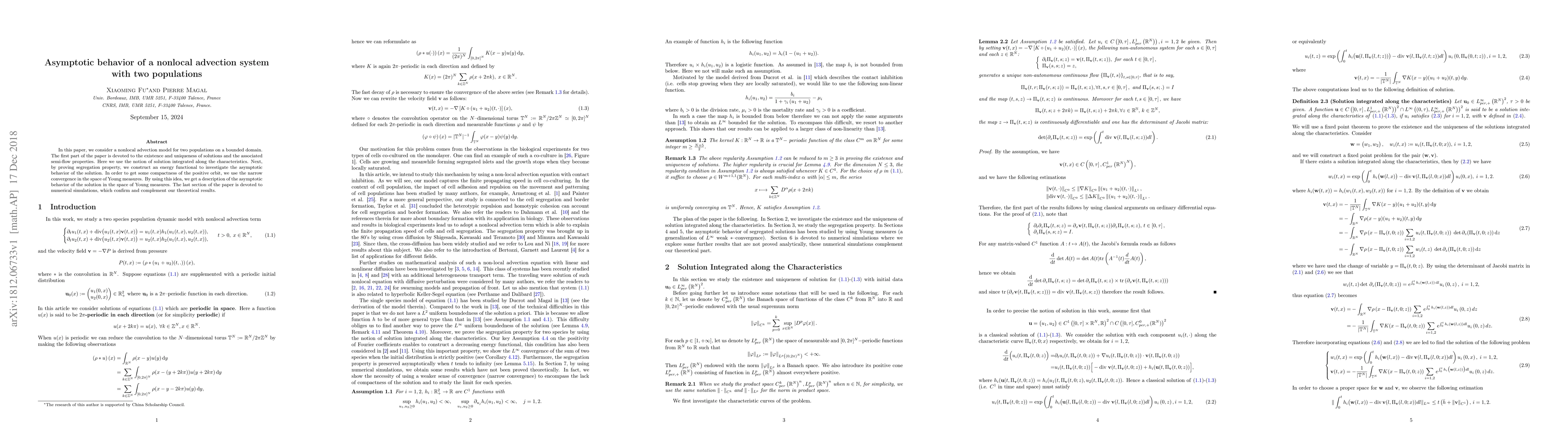 In this paper, we consider a nonlocal advection model for two populations on a bounded domain. The first part of the paper is devoted to the existence and uniqueness of solutions and the associated semi-flow properties. Here we use the notion of solution integrated along the characteristics. Next, by proving segregation property, we construct an energy functional to investigate the asymptotic behavior of the solution. In order to get some compactness of the positive orbit, we use the narrow convergence in the space of Young measures. By using this idea, we get a description of the asymptotic behavior of the solution in the space of Young measures. The last section of the paper is devoted to numerical simulations, which confirm and complement our theoretical results.