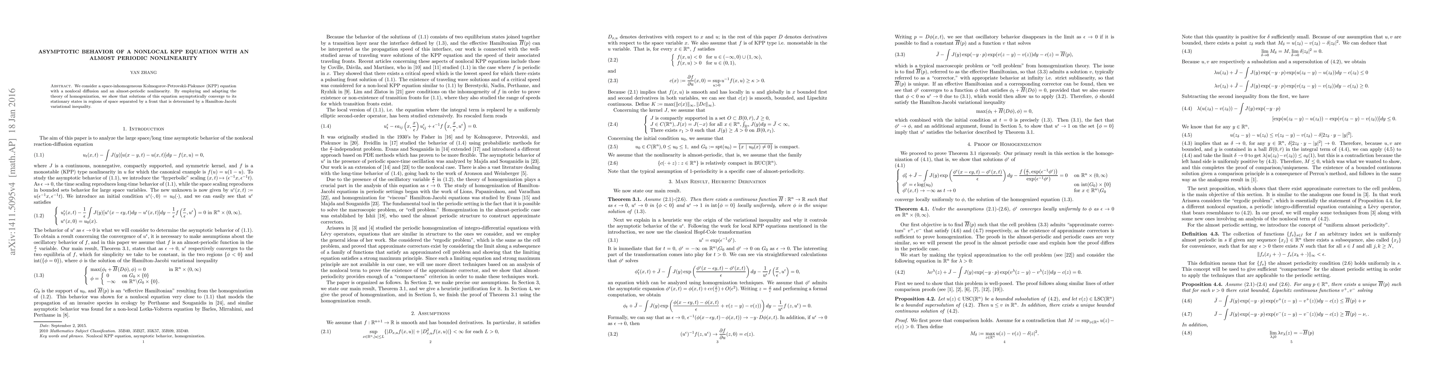 We consider a space-inhomogeneous Kolmogorov-Petrovskii-Piskunov (KPP) equation with a nonlocal diffusion and an almost-periodic nonlinearity. By employing and adapting the theory of homogenization, we show that solutions of this equation asymptotically converge to its stationary states in regions of space separated by a front that is determined by a Hamilton-Jacobi variational inequality.