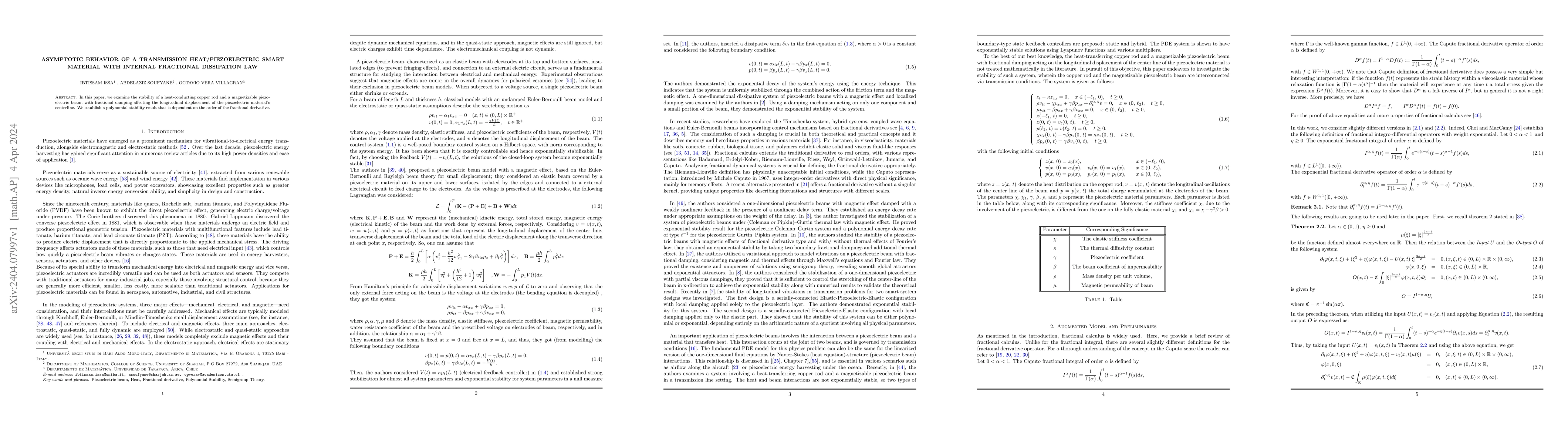 Summary: This research investigates the stability of a copper rod and piezoelectric beam with fractional dissipation, establishing polynomial stability dependent on the fractional derivative's order. The focus is on the long-term behavior of these materials under heat and piezoelectric effects.