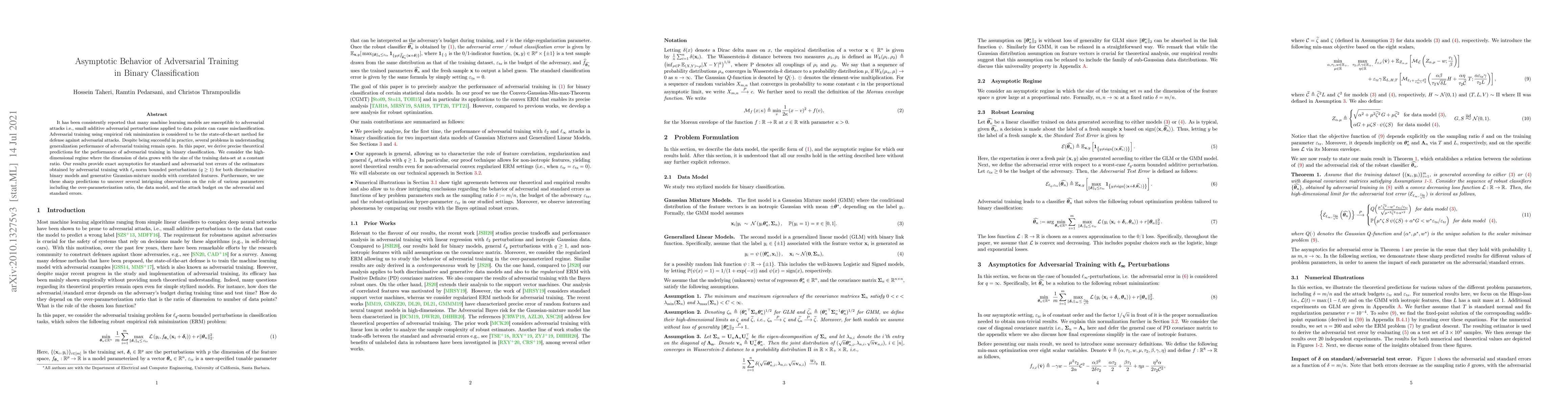 This paper derives theoretical predictions for adversarial training in binary classification, providing exact asymptotics for test errors in high-dimensional settings. It uncovers insights on how parameters like over-parameterization ratio and attack budget influence adversarial and standard errors.