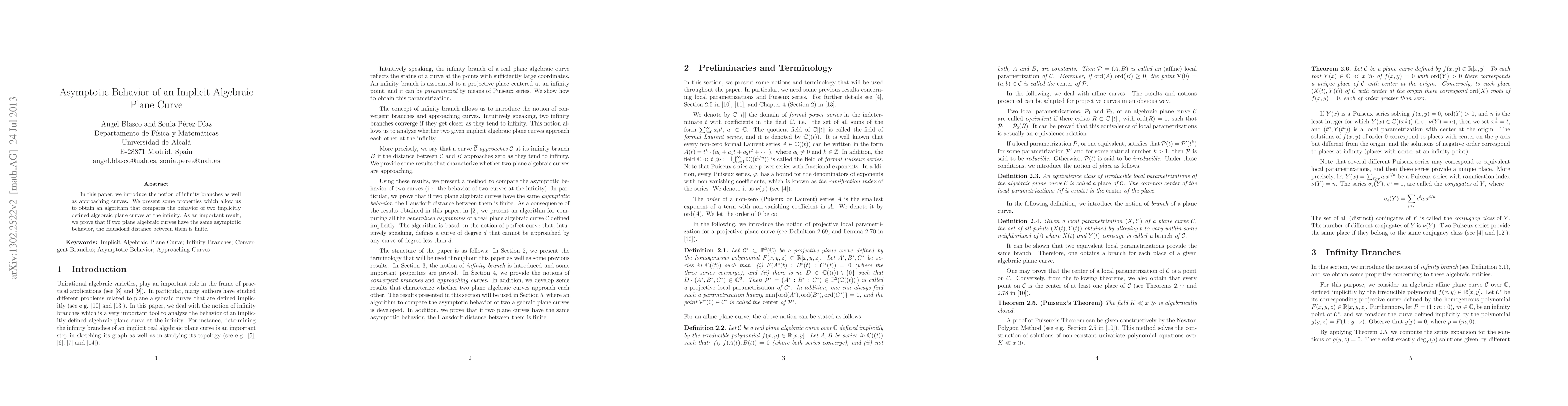 In this paper, we introduce the notion of infinity branches as well as approaching curves. We present some properties which allow us to obtain an algorithm that compares the behavior of two implicitly defined algebraic plane curves at the infinity. As an important result, we prove that if two plane algebraic curves have the same asymptotic behavior, the Hausdorff distance between them is finite.