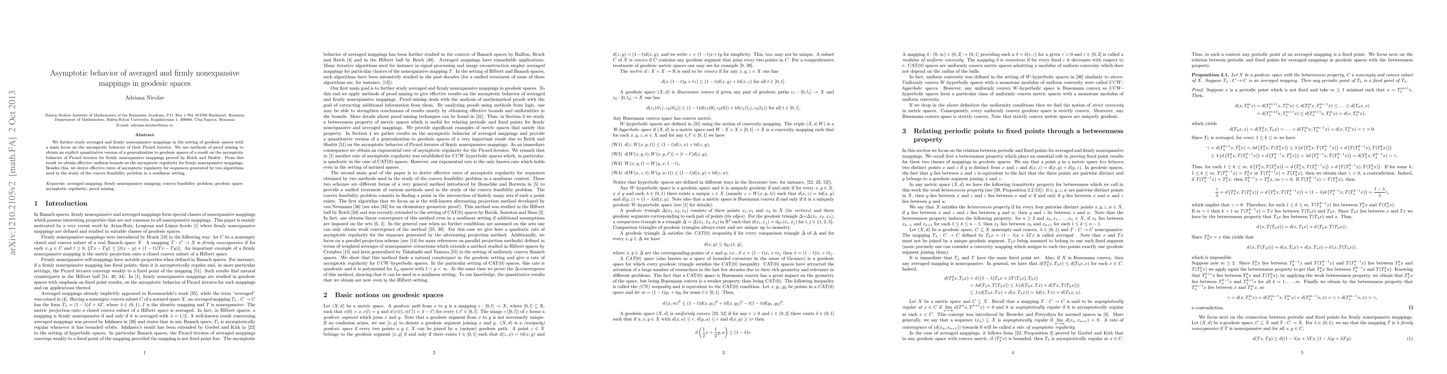 This paper investigates the asymptotic behavior of averaged and firmly nonexpansive mappings in geodesic spaces, focusing on the convergence of their Picard iterates. By employing proof mining techniques, the authors generalize a result on asymptotic behavior to geodesic spaces and derive effective uniform bounds and rates of convergence for sequences generated by algorithms in convex feasibility problems.