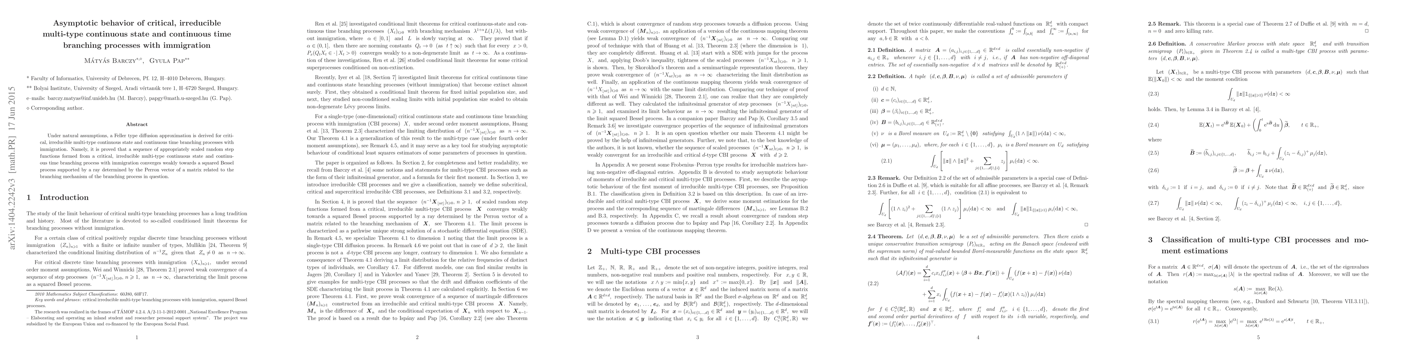 This paper derives a Feller type diffusion approximation for critical, irreducible multi-type continuous state and continuous time branching processes with immigration, showing that scaled random step functions converge weakly towards a squared Bessel process. The limiting process is determined by the Perron vector of a matrix related to the branching mechanism.