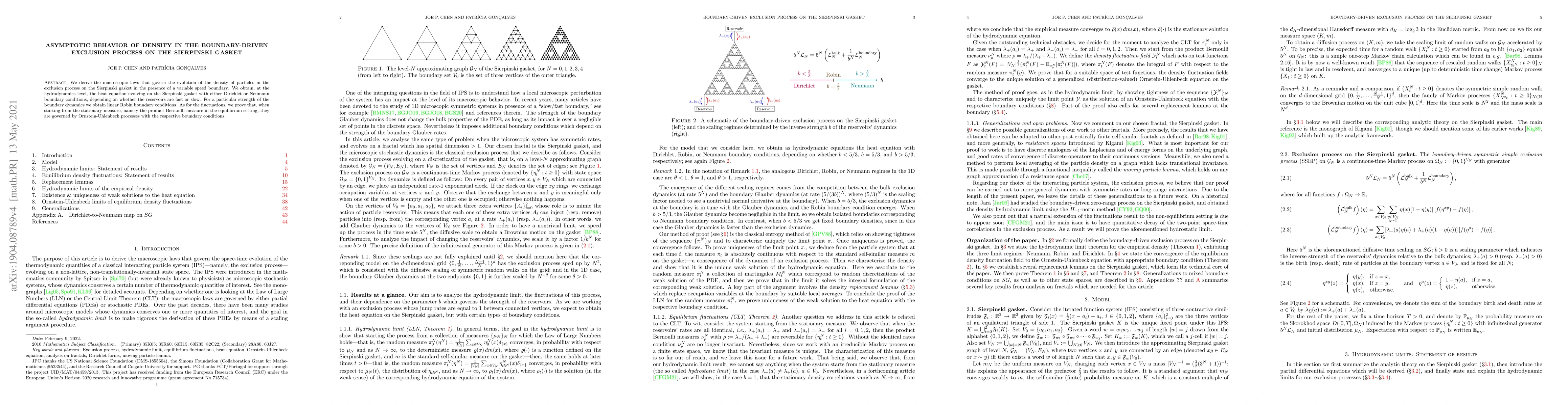 Researchers studied how particles move on a complex shape called the Sierpinski gasket with varying boundary speeds, finding that density behaves like heat in certain conditions and follows an Ornstein-Uhlenbeck process for fluctuations.