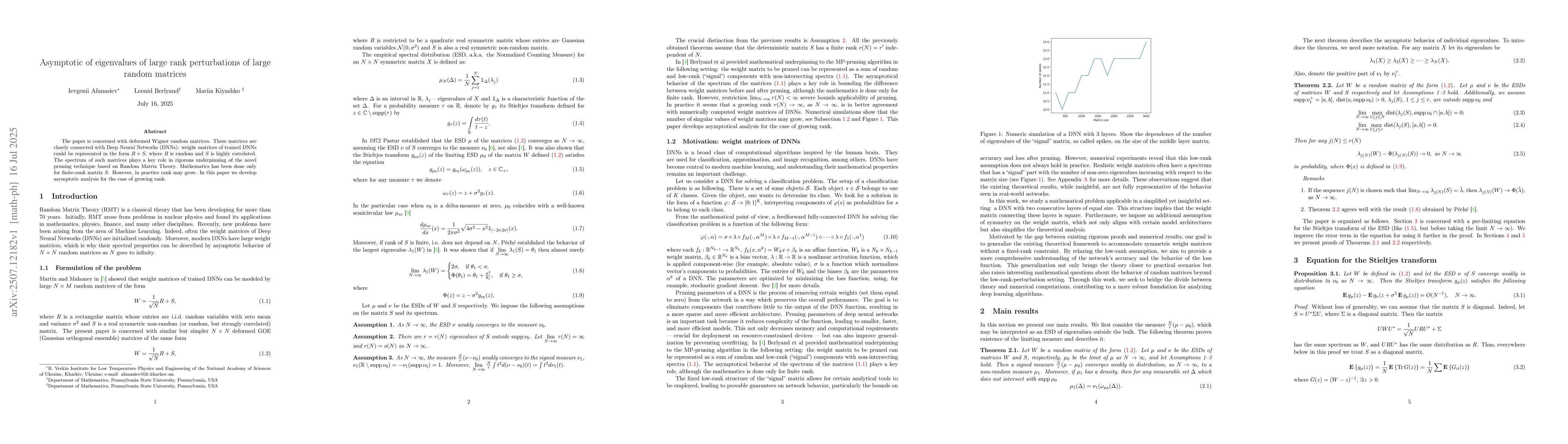 The paper is concerned with deformed Wigner random matrices. These matrices are closely connected with Deep Neural Networks (DNNs): weight matrices of trained DNNs could be represented in the form $R + S$, where $R$ is random and $S$ is highly correlated. The spectrum of such matrices plays a key role in rigorous underpinning of the novel pruning technique based on Random Matrix Theory. Mathematics has been done only for finite-rank matrix $S$. However, in practice rank may grow. In this paper we develop asymptotic analysis for the case of growing rank.
