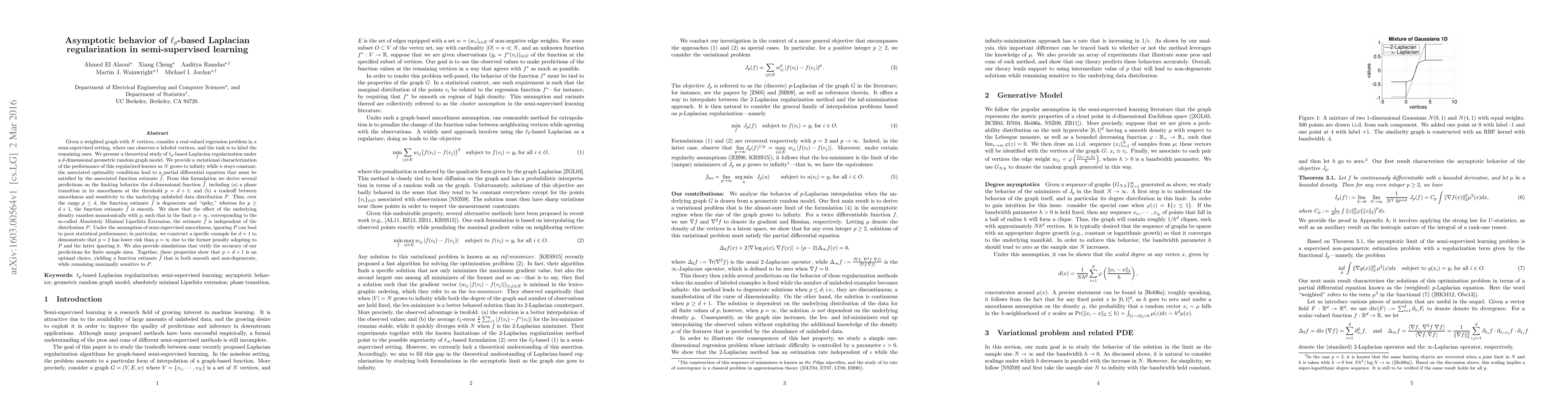 Given a weighted graph with $N$ vertices, consider a real-valued regression problem in a semi-supervised setting, where one observes $n$ labeled vertices, and the task is to label the remaining ones. We present a theoretical study of $\ell_p$-based Laplacian regularization under a $d$-dimensional geometric random graph model. We provide a variational characterization of the performance of this regularized learner as $N$ grows to infinity while $n$ stays constant, the associated optimality conditions lead to a partial differential equation that must be satisfied by the associated function estimate $\hat{f}$. From this formulation we derive several predictions on the limiting behavior the $d$-dimensional function $\hat{f}$, including (a) a phase transition in its smoothness at the threshold $p = d + 1$, and (b) a tradeoff between smoothness and sensitivity to the underlying unlabeled data distribution $P$. Thus, over the range $p \leq d$, the function estimate $\hat{f}$ is degenerate and "spiky," whereas for $p\geq d+1$, the function estimate $\hat{f}$ is smooth. We show that the effect of the underlying density vanishes monotonically with $p$, such that in the limit $p = \infty$, corresponding to the so-called Absolutely Minimal Lipschitz Extension, the estimate $\hat{f}$ is independent of the distribution $P$. Under the assumption of semi-supervised smoothness, ignoring $P$ can lead to poor statistical performance, in particular, we construct a specific example for $d=1$ to demonstrate that $p=2$ has lower risk than $p=\infty$ due to the former penalty adapting to $P$ and the latter ignoring it. We also provide simulations that verify the accuracy of our predictions for finite sample sizes. Together, these properties show that $p = d+1$ is an optimal choice, yielding a function estimate $\hat{f}$ that is both smooth and non-degenerate, while remaining maximally sensitive to $P$.