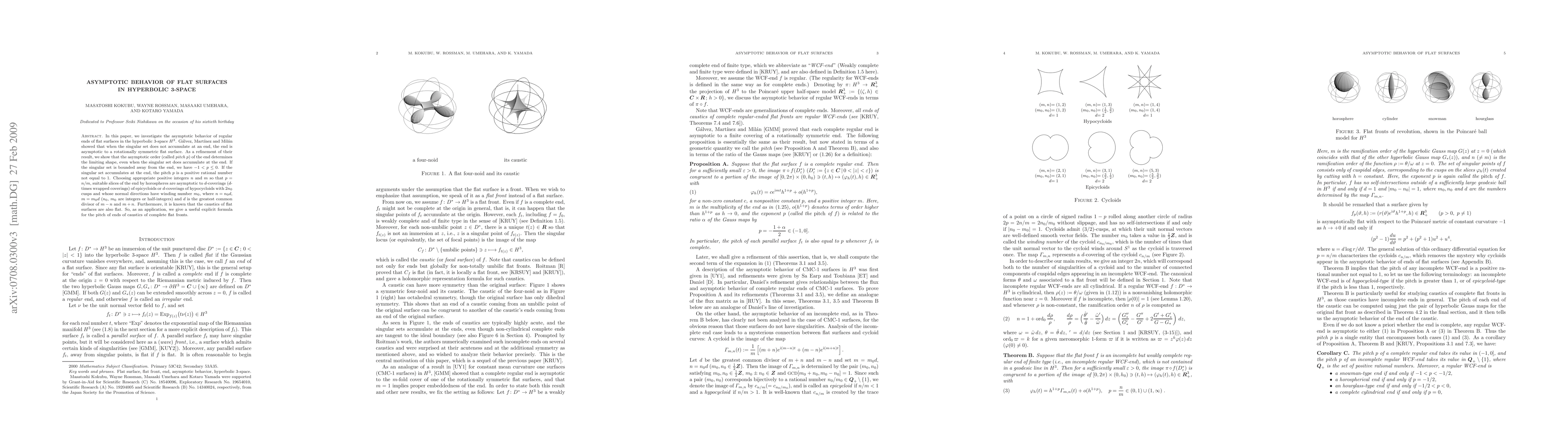 In this paper, we investigate the asymptotic behavior of regular ends of flat surfaces in the hyperbolic 3-space H^3. Galvez, Martinez and Milan showed that when the singular set does not accumulate at an end, the end is asymptotic to a rotationally symmetric flat surface. As a refinement of their result, we show that the asymptotic order (called "pitch" p) of the end determines the limiting shape, even when the singular set does accumulate at the end. If the singular set is bounded away from the end, we have -1