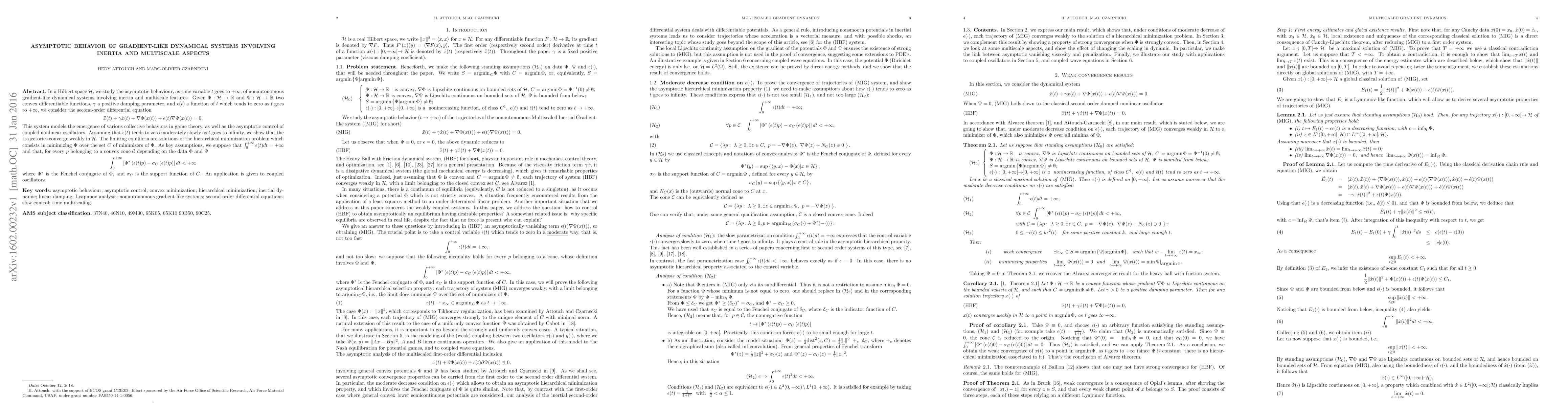 In a Hilbert space $\mathcal H$, we study the asymptotic behaviour, as time variable $t$ goes to $+\infty$, of nonautonomous gradient-like dynamical systems involving inertia and multiscale features. Given $\mathcal H$ a general Hilbert space, $\Phi: \mathcal H \rightarrow \mathbb R$ and $\Psi: \mathcal H \rightarrow \mathbb R$ two convex differentiable functions, $\gamma$ a positive damping parameter, and $\epsilon (t)$ a function of $t$ which tends to zero as $t$ goes to $+\infty$, we consider the second-order differential equation $$\ddot{x}(t) + \gamma \dot{x}(t) + \nabla \Phi (x(t)) + \epsilon (t) \nabla \Psi (x(t)) = 0. $$ This system models the emergence of various collective behaviors in game theory, as well as the asymptotic control of coupled nonlinear oscillators. Assuming that $\epsilon(t)$ tends to zero moderately slowly as $t$ goes to infinity, we show that the trajectories converge weakly in $\mathcal H$. The limiting equilibria are solutions of the hierarchical minimization problem which consists in minimizing $\Psi$ over the set $C$ of minimizers of $\Phi$. As key assumptions, we suppose that $ \int_{0}^{+\infty}\epsilon (t) dt = + \infty $ and that, for every $p$ belonging to a convex cone $\mathcal C$ depending on the data $\Phi$ and $\Psi$ $$ \int_{0}^{+\infty} \left[\Phi^* \left(\epsilon (t)p\right) -\sigma_C \left(\epsilon (t)p\right)\right]dt < + \infty $$ where $\Phi^*$ is the Fenchel conjugate of $\Phi$, and $\sigma_C $ is the support function of $C$. An application is given to coupled oscillators.