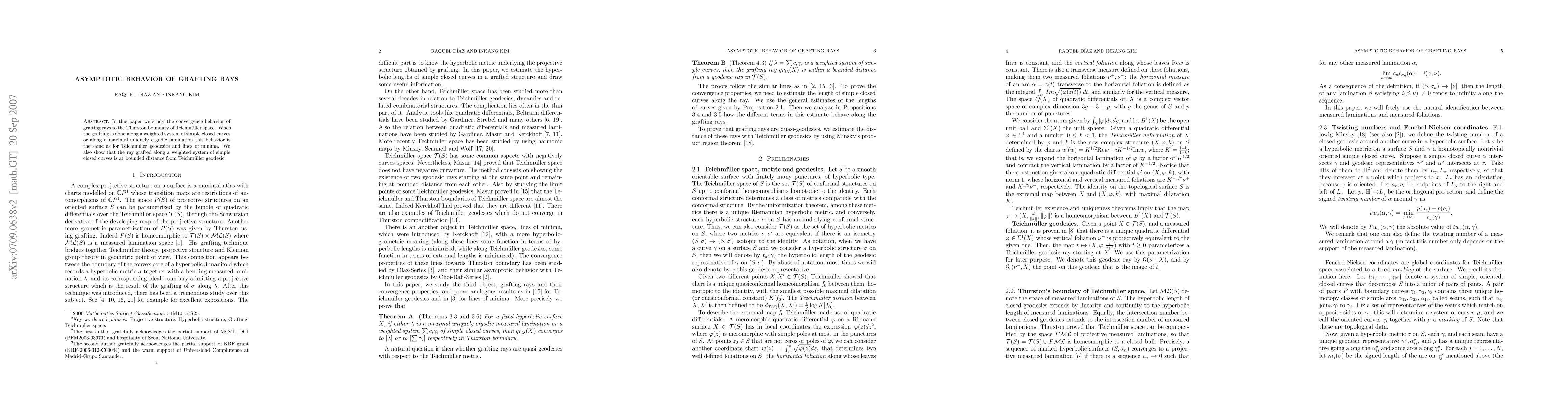 This paper investigates the asymptotic behavior of grafting rays converging to the Thurston boundary in Teichmuller space, showing that such rays behave similarly to Teichmuller geodesics and lines of minima when grafting along weighted simple closed curves or maximal uniquely ergodic laminations, and that they remain at a bounded distance from Teichmuller geodesics.