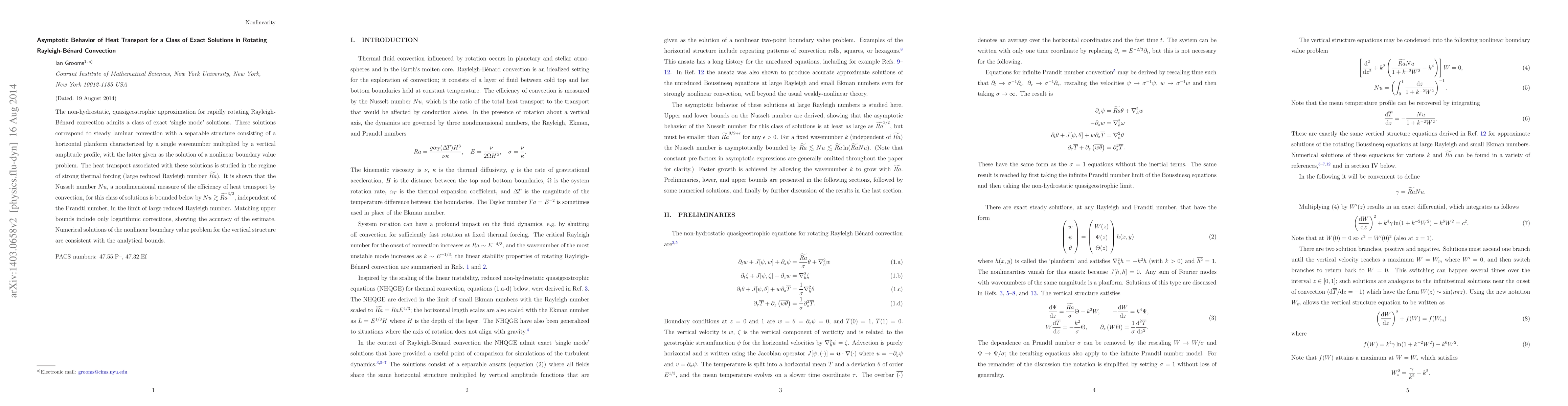 The non-hydrostatic, quasigeostrophic approximation for rapidly rotating Rayleigh-B\'enard convection admits a class of exact `single mode' solutions. These solutions correspond to steady laminar convection with a separable structure consisting of a horizontal planform characterized by a single wavenumber multiplied by a vertical amplitude profile, with the latter given as the solution of a nonlinear boundary value problem. The heat transport associated with these solutions is studied in the regime of strong thermal forcing (large reduced Rayleigh number $\widetilde{Ra}$). It is shown that the Nusselt number $Nu$, a nondimensional measure of the efficiency of heat transport by convection, for this class of solutions is bounded below by $Nu\gtrsim \widetilde{Ra}^{3/2}$, independent of the Prandtl number, in the limit of large reduced Rayleigh number. Matching upper bounds include only logarithmic corrections, showing the accuracy of the estimate. Numerical solutions of the nonlinear boundary value problem for the vertical structure are consistent with the analytical bounds.