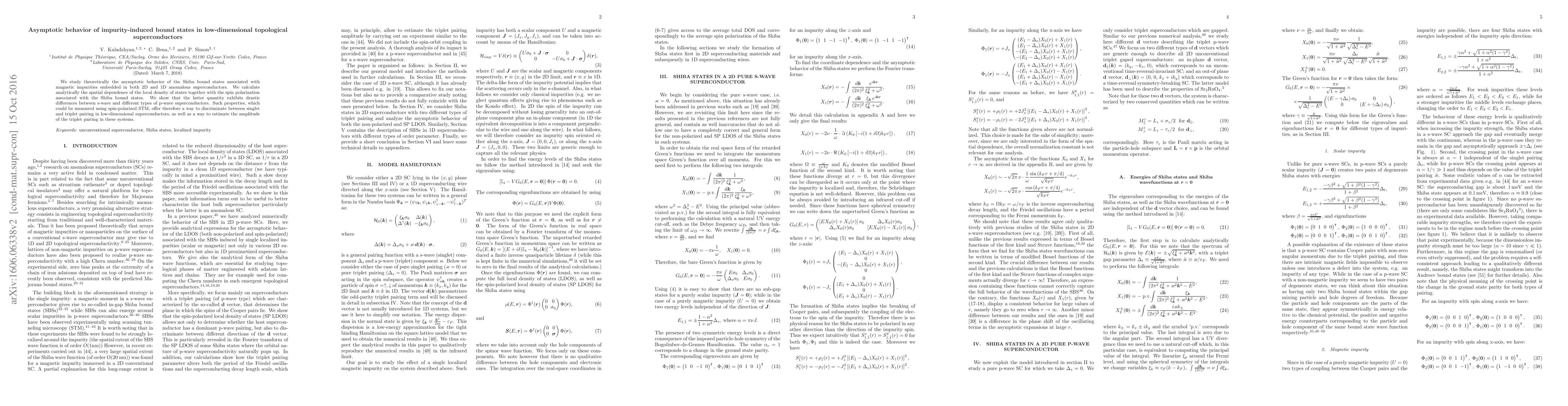 We study theoretically the asymptotic behavior of the Shiba bound states associated with magnetic impurities embedded in both 2D and 1D anomalous superconductors. We calculate analytically the spatial dependence of the local density of states together with the spin polarization associated with the Shiba bound states. We show that the latter quantity exhibits drastic differences between s-wave and different types of p-wave superconductors. Such properties, which could be measured using spin-polarized STM, offer therefore a way to discriminate between singlet and triplet pairing in low-dimensional superconductors, as well as a way to estimate the amplitude of the triplet pairing in these systems.