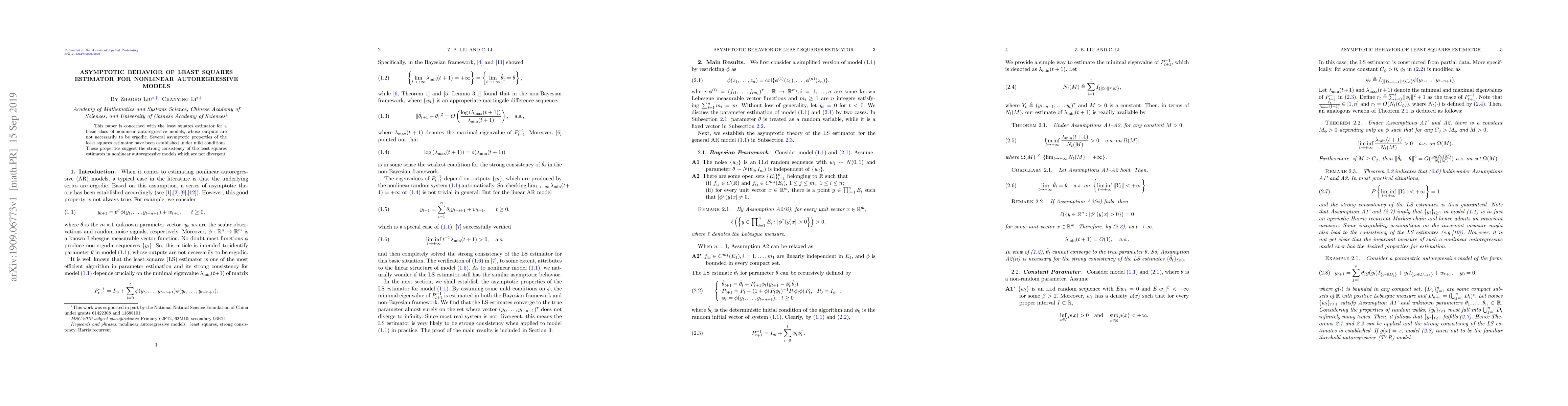 This paper is concerned with the least squares estimator for a basic class of nonlinear autoregressive models, whose outputs are not necessarily to be ergodic. Several asymptotic properties of the least squares estimator have been established under mild conditions. These properties suggest the strong consistency of the least squares estimates in nonlinear autoregressive models which are not divergent.