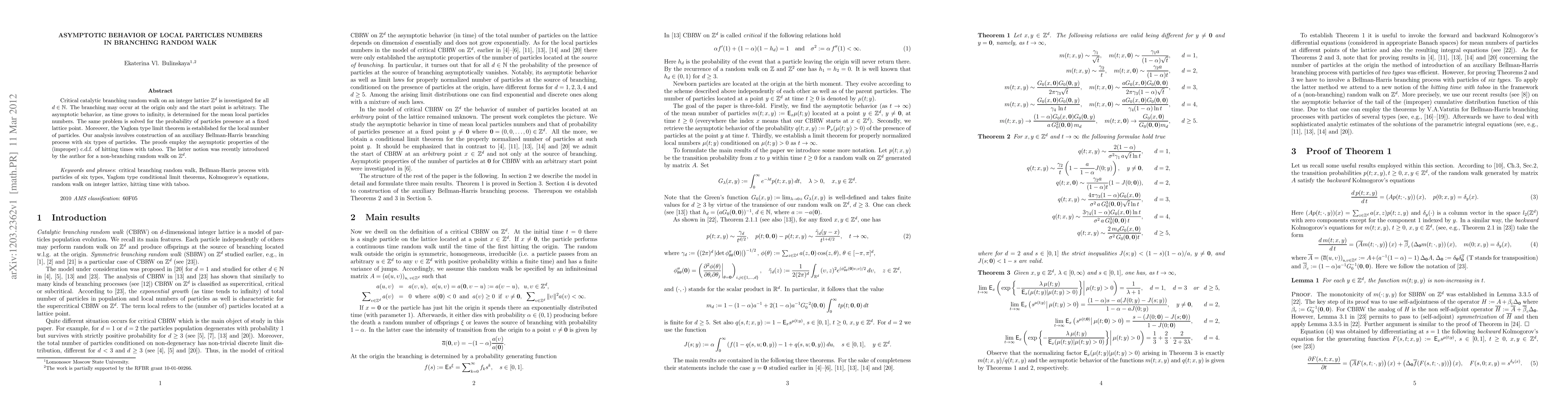 This paper investigates the asymptotic behavior of local particle numbers in critical catalytic branching random walk on d-dimensional lattices. It determines the mean local particle numbers and the probability of particle presence at fixed points, establishing a Yaglom type limit theorem for local particle counts.