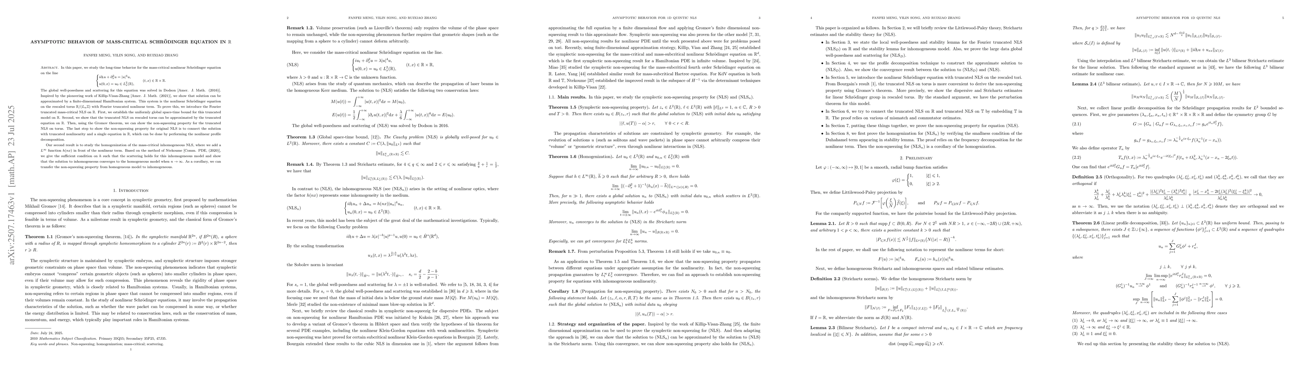 In this paper, we study the long-time behavior for the mass-critical nonlinear Schr\"odinger equation on the line \[ i\partial_t u + \partial_x^2 u = |u|^4 u, u(0, x) = u_0 \in L_x^2(\Bbb R). \] The global well-posedness and scattering for this equation was solved in Dodson [Amer. J. Math. (2016)]. Inspired by the pioneering work of Killip-Visan-Zhang [Amer. J. Math. (2021)], we show that solution can be approximated by a finite-dimensional Hamiltonian system. This system is the nonlinear Schr\"odinger equation on the rescaled torus $\Bbb R/(L_n\Bbb Z)$ with Fourier truncated nonlinear term. To prove this, we introduce the Fourier truncated mass-critical NLS on $\mathbb{R}$. First, we establish the uniformly global space-time bound for this truncated model on $\mathbb{R}$. Second, we show that the truncated NLS on rescaled torus can be approximated by the truncated equation on $\Bbb R$. Then, using the Gromov theorem, we can show the non-squeezing property for the truncated NLS on torus. The last step to show the non-squeezing property for original NLS is to connect the solution with truncated nonlinearity and a single equation in $\mathbb{R}$, which can be done by performing the nonlinear profile decomposition. Our second result is to study the homogenization of the mass-critical inhomogeneous NLS, where we add a $L^\infty$ function $h(nx)$ in front of the nonlinear term. Based on the method of Ntekoume [Comm. PDE, (2020)], we give the sufficient condition on $h$ such that the scattering holds for this inhomogeneous model and show that the solution to inhomogeneous converges to the homogeneous model when $n\to\infty$. As a corollary, we can transfer the non-squeezing property from homogeneous model to inhomogeneous.