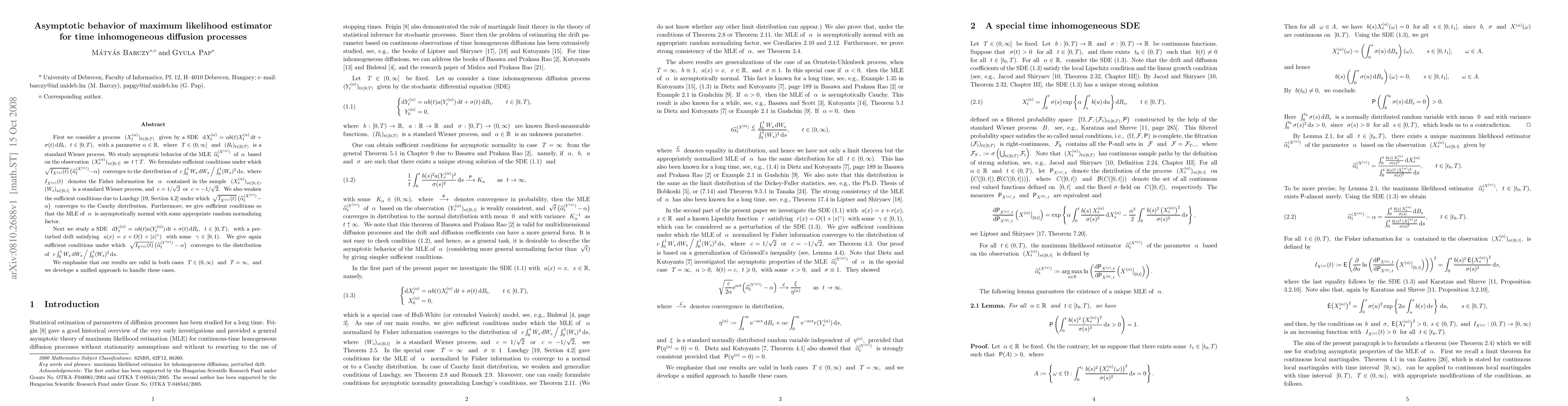 We study asymptotic behavior of maximum likelihood estimator for a time inhomogeneous diffusion process given by a SDE $dX_t=\alpha b(t)X_t dt + \sigma(t) dB_t$, $t\in[0,T)$, with a parameter $\alpha\in R$, where $T\in(0,\infty]$ and $(B_t)_{t\in[0,T)}$ is a standard Wiener process. We formulate sufficient conditions under which the MLE of $\alpha$ normalized by Fisher information converges to the limit distribution of Dickey-Fuller statistics. Next we study a SDE $dY_t=\alpha b(t)a(Y_t) dt + \sigma(t) dB_t$, $t\in[0,T)$, with a perturbed drift satisfying $a(x)=x+O(1+|x|^\gamma)$ with some $\gamma\in[0,1)$. We give again sufficient conditions under which the MLE of $\alpha$ normalized by Fisher information converges to the limit distribution of Dickey-Fuller statistics.