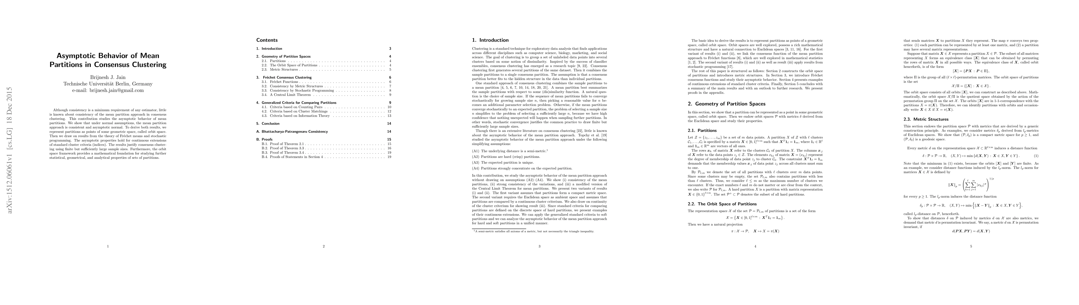 This paper investigates the asymptotic behavior of mean partitions in consensus clustering, demonstrating their consistency and asymptotic normality under normal assumptions. It utilizes the orbit space framework and results from Fr\'echet means and stochastic programming to justify the use of consensus clustering with sufficiently large sample sizes.