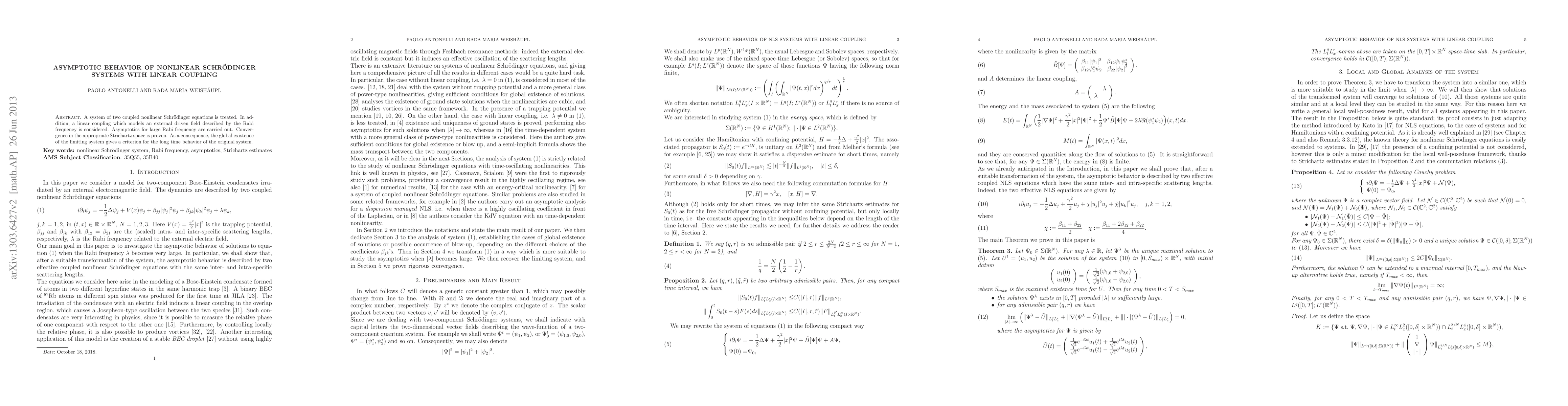 A system of two coupled nonlinear Schroedinger equations is treated. In addition, a linear coupling which models an external driven field described by the Rabi frequency is considered. Asymptotics for large Rabi frequency are carried out. Convergence in the appropriate Strichartz space is proven. As a consequence, the global existence of the limiting system gives a criterion for the long time behavior of the original system.