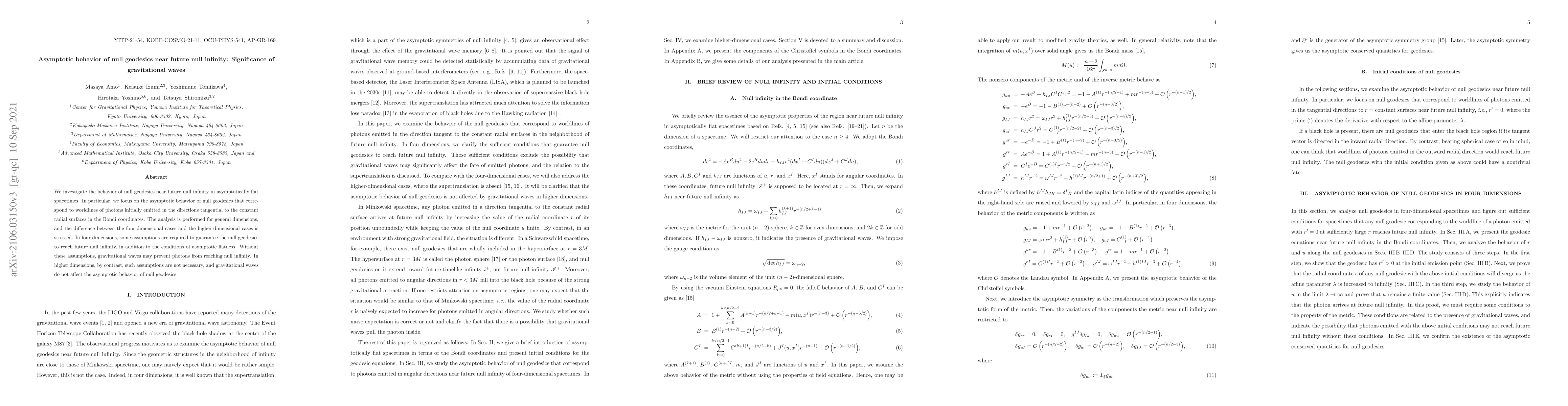 This paper examines the asymptotic behavior of null geodesics near future null infinity in asymptotically flat spacetimes, highlighting the role of gravitational waves. In four dimensions, specific assumptions are needed for photons to reach null infinity, while in higher dimensions, gravitational waves do not impact this behavior.