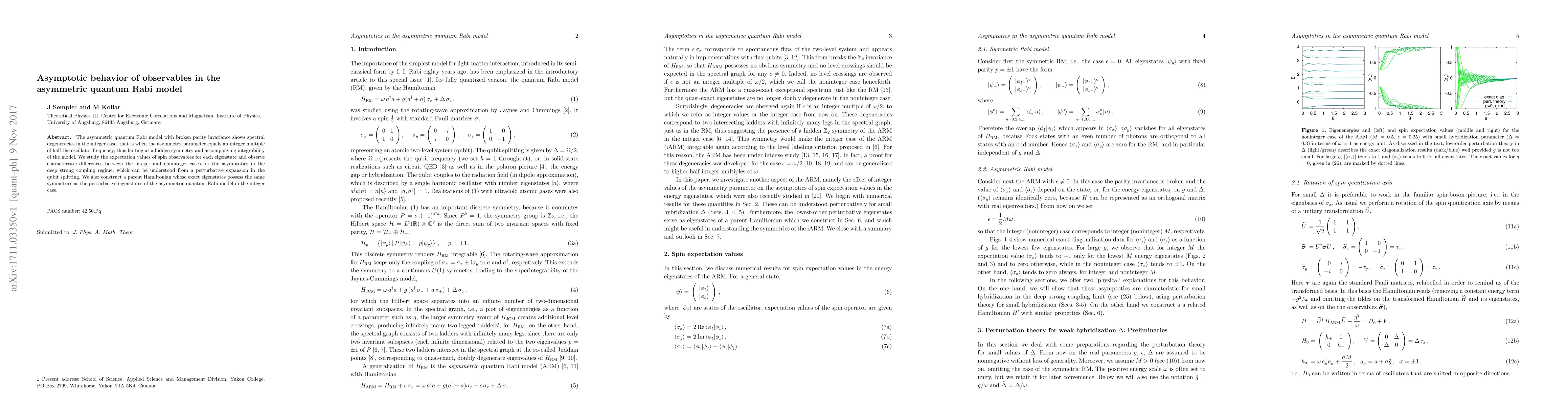 This paper investigates the asymptotic behavior of spin observables in the asymmetric quantum Rabi model, revealing spectral degeneracies and hidden symmetries when the asymmetry parameter is an integer multiple of the oscillator frequency. It finds distinct asymptotic differences between integer and noninteger cases in the strong coupling regime, explained via a perturbative expansion.