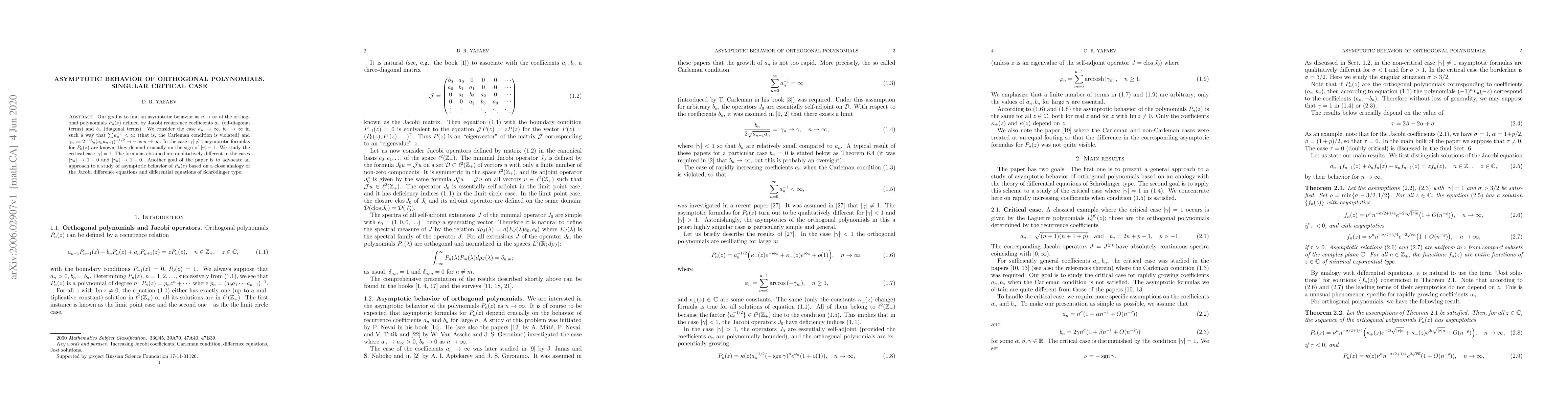 This paper studies the asymptotic behavior of orthogonal polynomials under specific conditions, particularly when the Jacobi recurrence coefficients approach infinity and the Carleman condition is violated. The study focuses on the critical case where the ratio of diagonal to off-diagonal terms approaches 1.