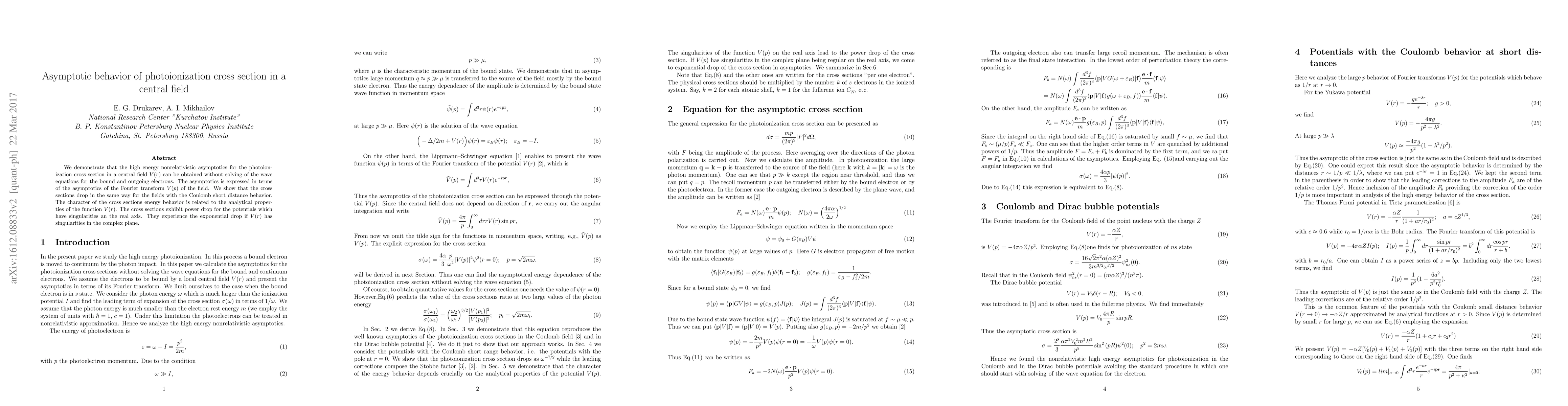 This paper investigates the high energy asymptotic behavior of the photoionization cross section in a central field, showing it can be expressed via the Fourier transform of the field. The cross sections' energy dependence is linked to the analytical properties of the field function, with power or exponential drops depending on the field's singularities.