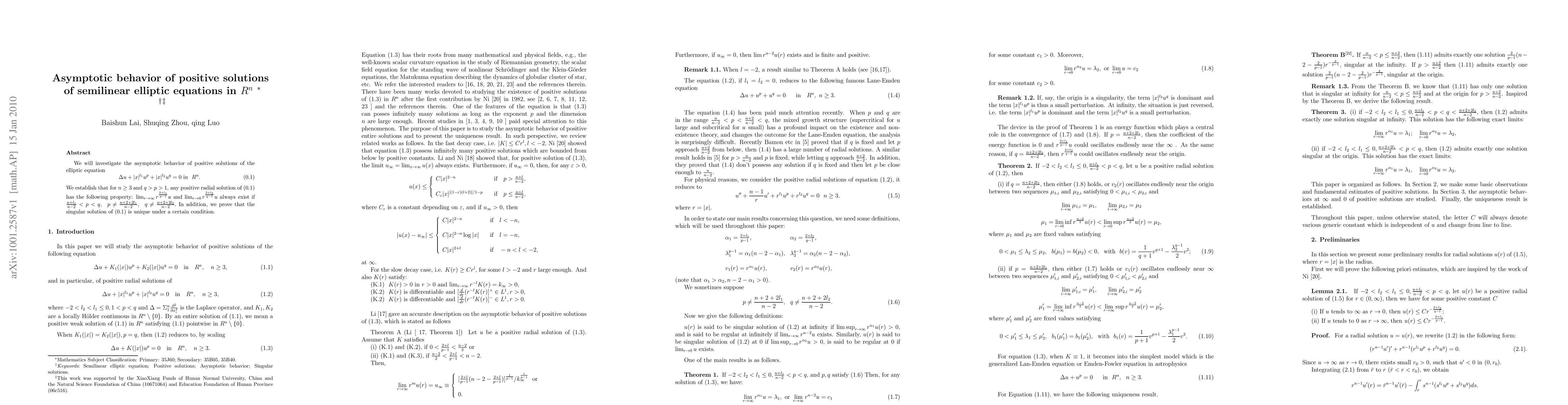 We will investigate the asymptotic behavior of positive solutions of the elliptic equation \Delta u+|x|^{l_{1}}u^{p}+|x|^{l_{2}}u^{q}=0 {in} R^{n}. We establish that for $n\geq 3$ and $q>p>1$, any positive radial solution of (0.1) has the following property: $\lim_{r\to\infty}r^{\frac{2+l_{1}}{p-1}}u$ and $\lim_{r\to0}r^{\frac{2+l_{2}}{q-1}}u$ always exist if $\frac{n+l_{1}}{n-2}